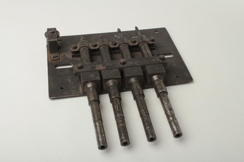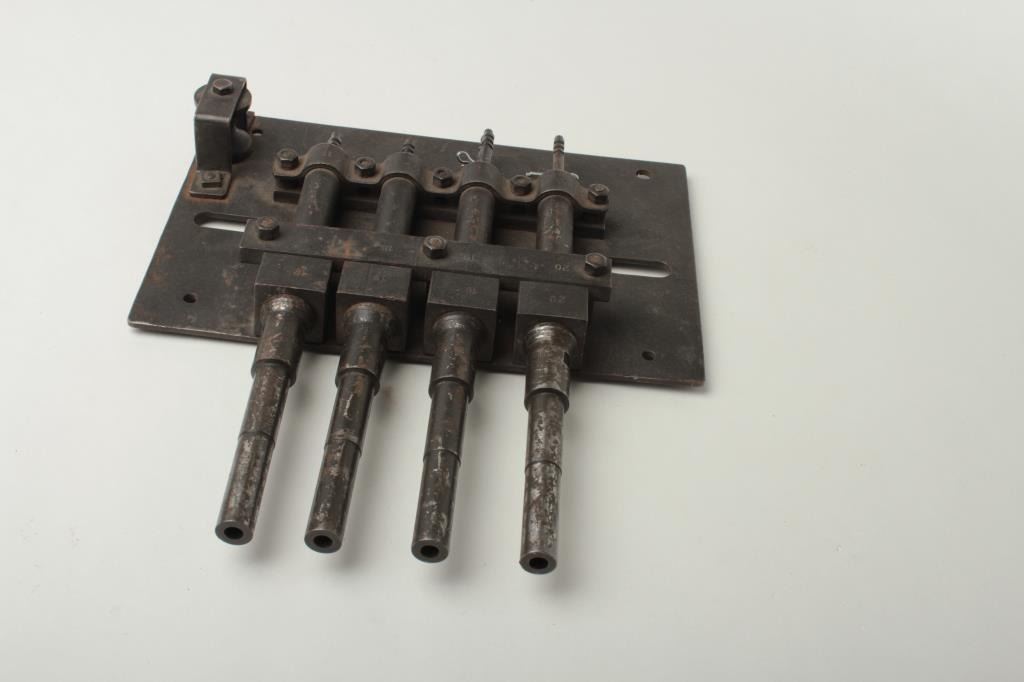 A volley trap gun consisting of four firing pin devices bolted to a steel plate and threaded with four six inch long rifled barrels. The barrels appear to be for some kind of bottle nose caliber in the .30 - .32range. There is a pulley device that one would assume would activate the firing pins when pulled. Each barrel and corresponding part is numbered 1-20, so again, one would assume that this was part of a larger volleydevice. Est:$400-600