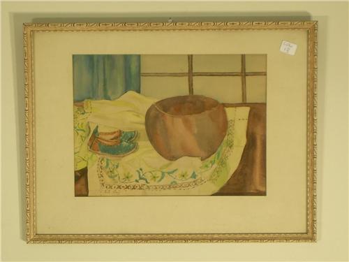 A watercolor Moroccan still life, signed ''Bob King,'' in a cream colored carved frame