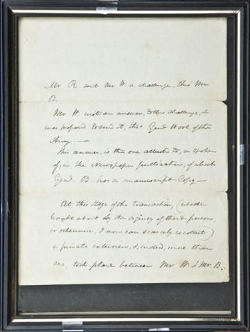 A well written and detailed challenge for a duel, three pages, folded into two, mentions General B., later identified as Breckenridge and identifies all other major players just by the first letters of the last name. Identifies a Mr. Lloyd, and mentions a prior letter being destroyed and sets out the details. We believe this to be General Breckenridge from Kentucky, a Confederate General during the Civil War, and was probably party to this incident as a second or judge and also ran for president in 1860. This document seems to be from the 1850’s. From the William R. Orbelo Collection. Est: $500 - $1,000