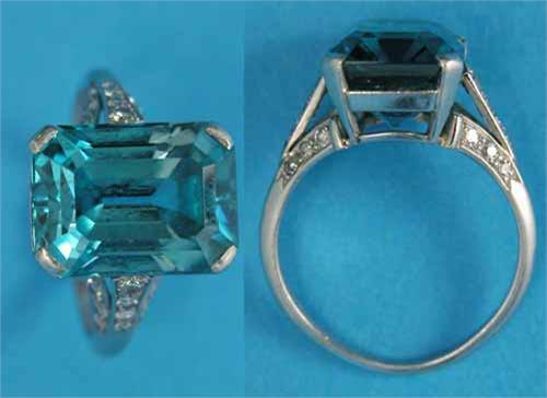 A white gold dress ring, claw-set with a rectangular cut blue zircon, the split shoulders set small diamonds £150-200