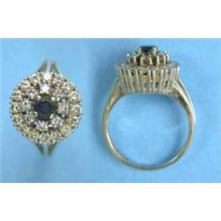 A white gold sapphire and diamond circular cluster ring, with openwork split shoulders...