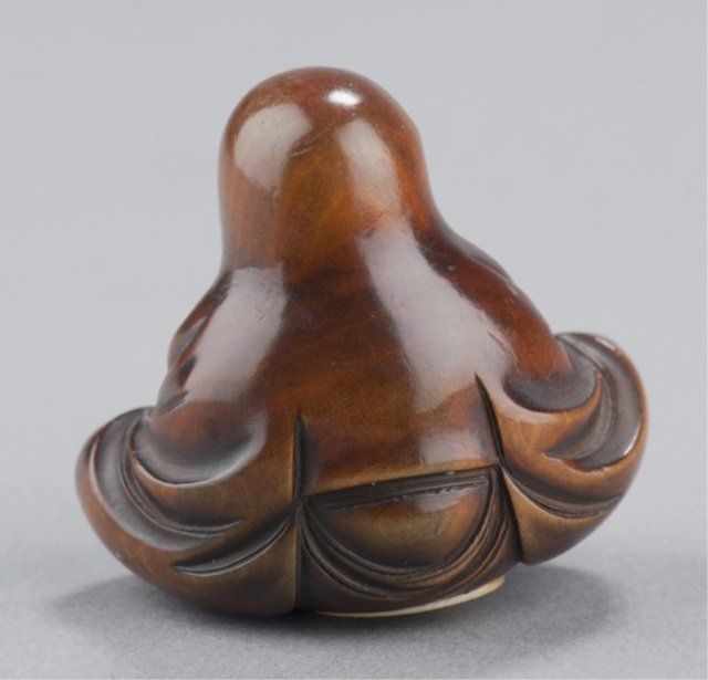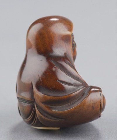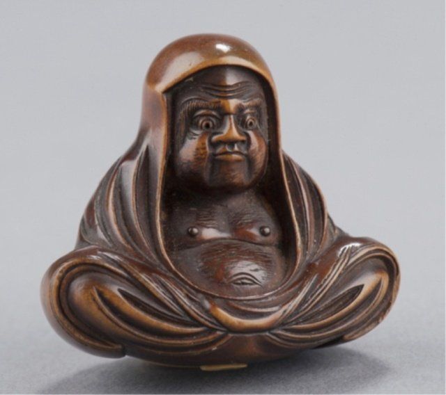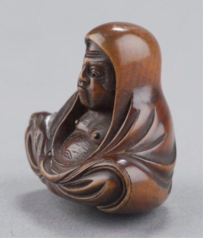 By Hara Shumin, Tokyo, Early 19th century. , Early 19th century. Sitting cross-legged and wrapped in his cloak during his nine years of ascetic religious contemplation. Himotoshi are lined with unstained ivory. Signed on underside, Shumin. 1 1/2in (3.7cm). Exhibited: the Student Center (August 29 - September 25, 1960)