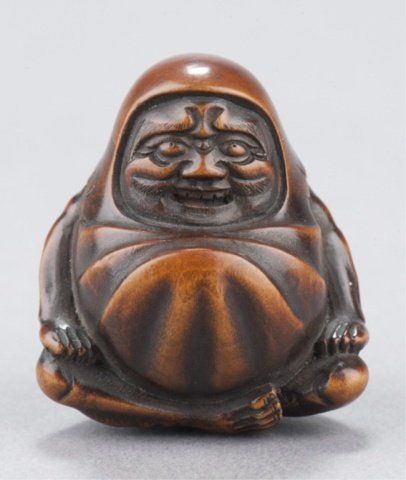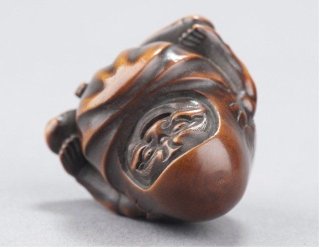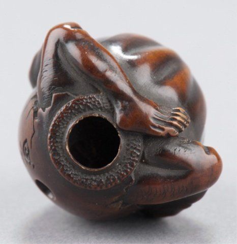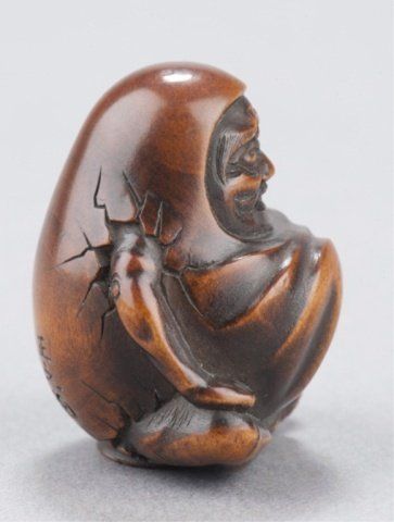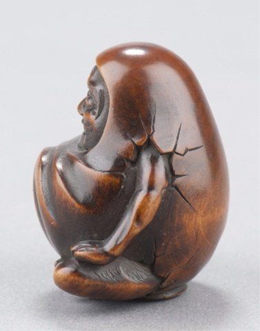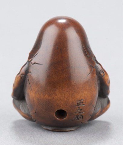 By Hoshinsai Masayuki, Tokyo, Mid 19th century. Enveloped by a bag which is beginning to crack as he emerges from it, one himotoshi is on the lower back and exits through a much larger himotoshi on the bottom which is surrounded by a stippled border Signed on the lower back to the right of the himotoshi, Masayuki plus kakihan. 1 3/8in (3.5cm).