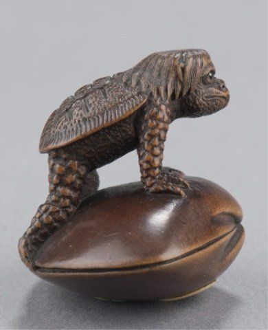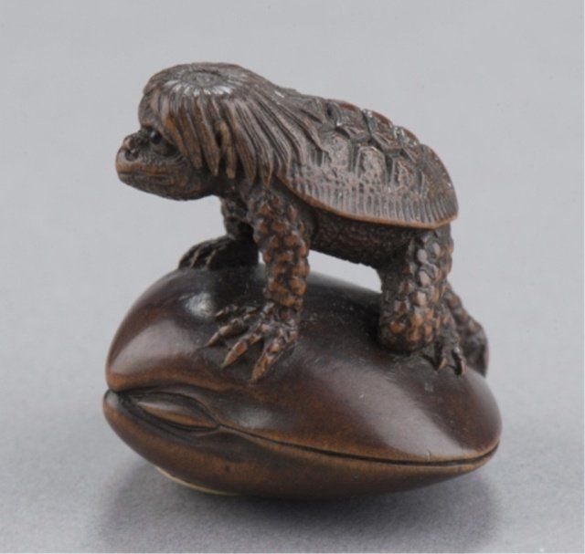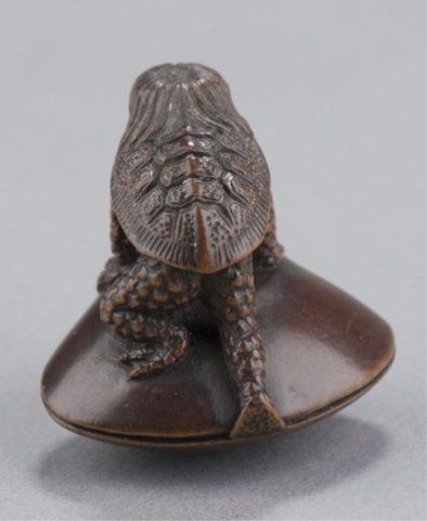 By Juzan, Early 19th century. Perched on clamshell with its foot caught in it, eyes inlaid in black. Signed on the underside in an irregular torpedo shaped reserve, Juzan. 1 3/8in (3.5cm). Provenance: Purchased from Joseph U. Seo, 1958.