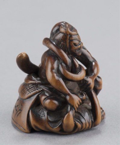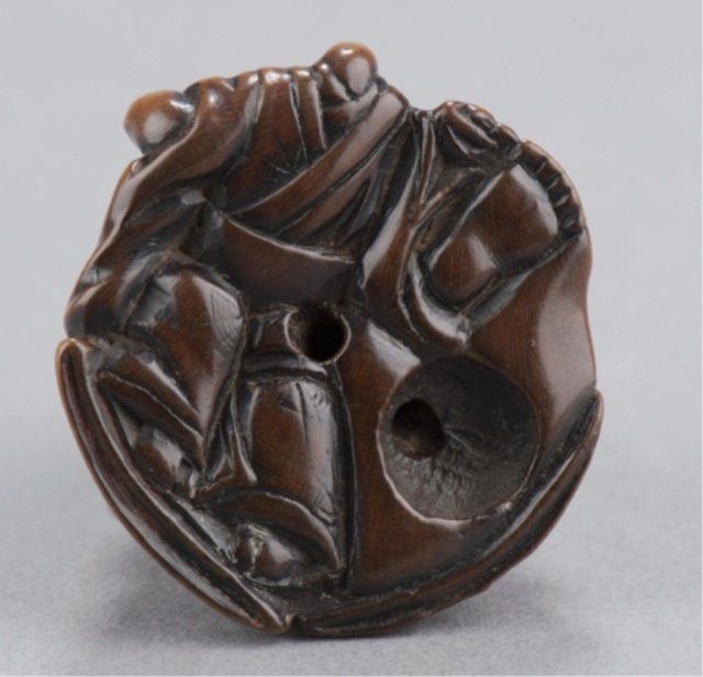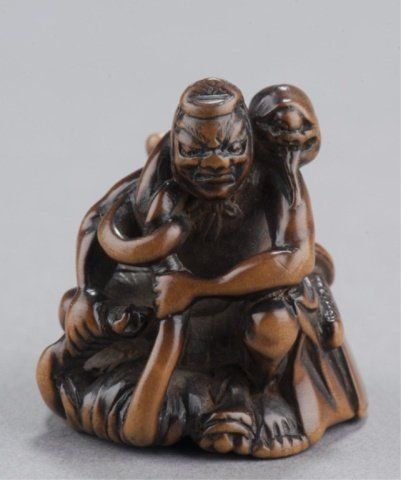 By Kokuzan. Early 19th century. Wrestling with the Demon Rokurokubi, well worn with a nice patina. Signed on the back, Kokuzan. 1 1/4in (3.2cm). Provenance: Purchased at auction at Hauswedell, Hamburg, Germany, May 20, 1963.