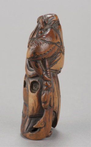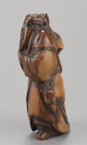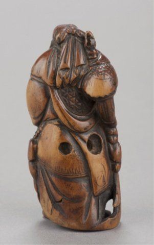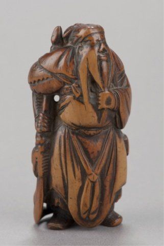 Attributed to Masatoshi(1781-1800). Late 18th century. Standing in full war-dress, his long halberd held down at his right side, his left hand strokes his full beard. Signed on reverse under himotoshi in an oval reserve, Masatoshi. 3 1/2in (9cm). Provenance: Barry Davies, London