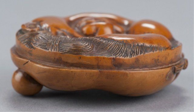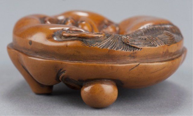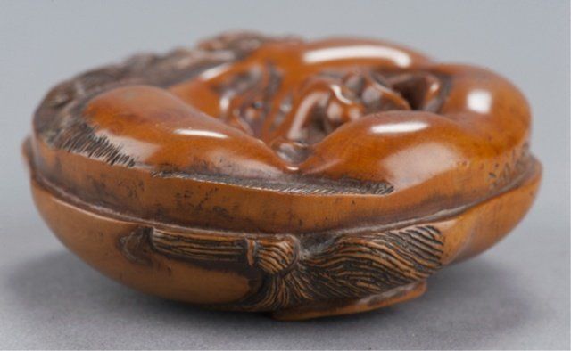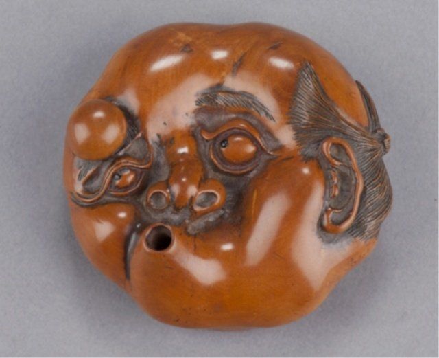 By Shiba fu. Mid 19th century. A Tonkotsu cover in a very hard wood. The underside of the cover is a mask of Okame while the upper side appears to be Usofuki with a large wen over his right eye. Pupils inlaid in black. Signed on the rim of the underside, Shiba fu, plus Kakihan. 2 5/8in (6.7cm).