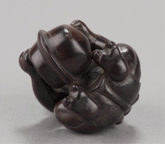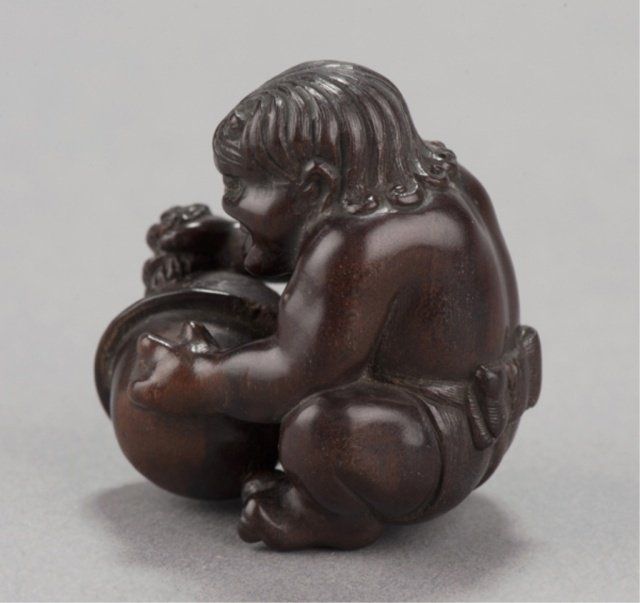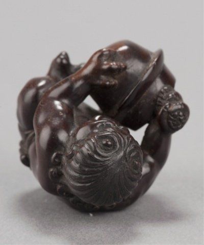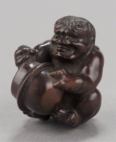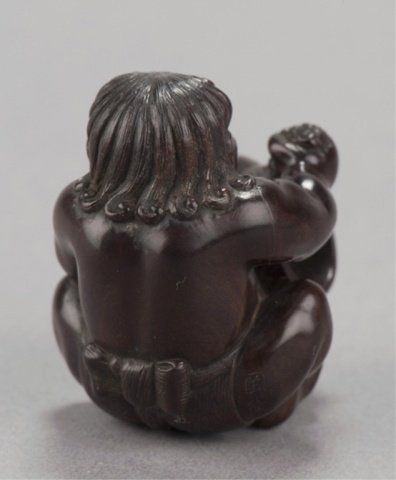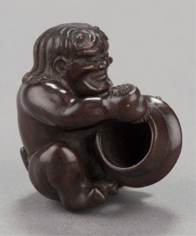 By Okatori, Kyoto, , Late 18th century. Polishing a pot, his horns appear to have been shorn off and wearing a tiger-skin loin cloth. Signed on the right rear buttocks without reserve, Okatori. 1 3/8in (3.6cm).
