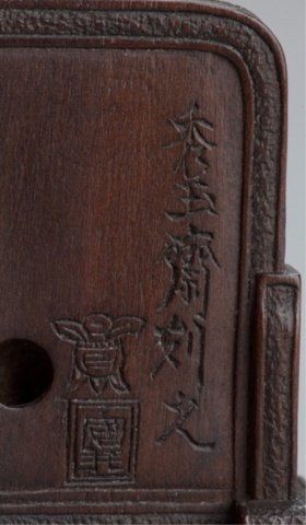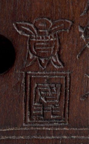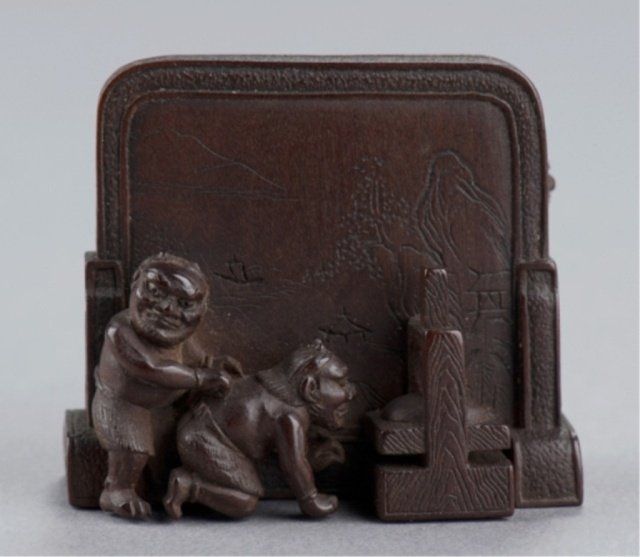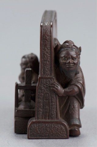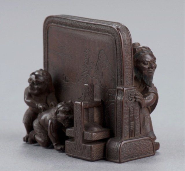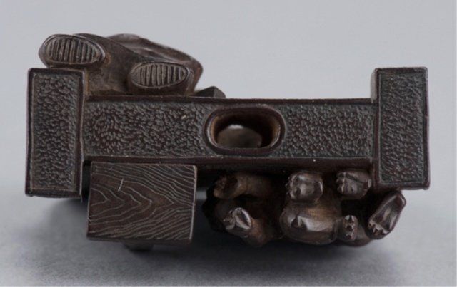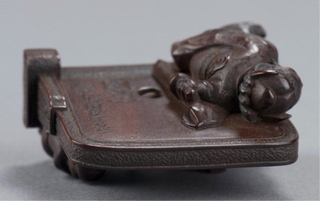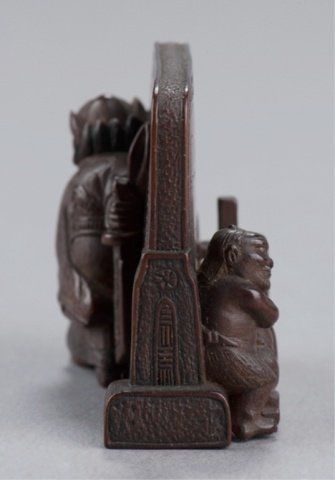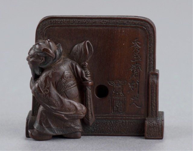 Shugyokusai (D2563), Tokyo, Mid 19th century. , Mid 19th century. Shoki chasing two Oni around a Tsuitate, the front with one of the Oni on all fours and the other standing behind him next to them is a wooden press of some sort. The reverse shows Shoki peering around the side of the tsuitate with his sword at the ready. Signed on the reverse, Shugyokusai koku kore, plus 2 seals, the first seal is a pot seal in the form of an archaic Chinese chia bronze vessel, the second is square with a double border and two unread characters inside. 1 5/8in (4cm).
