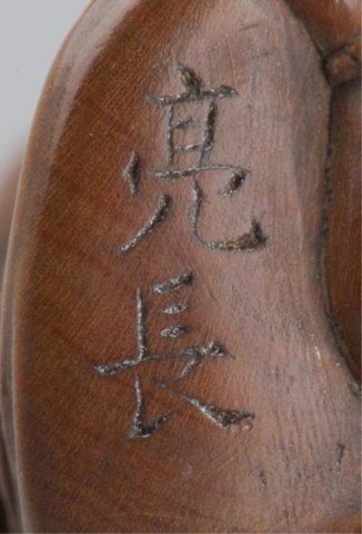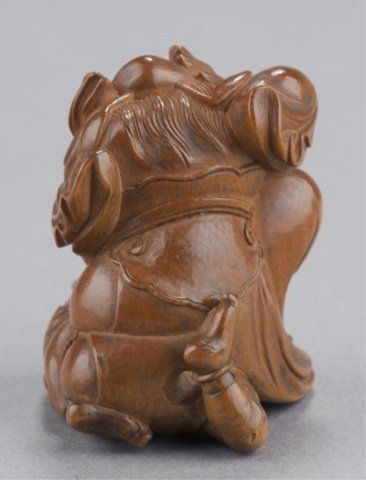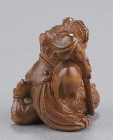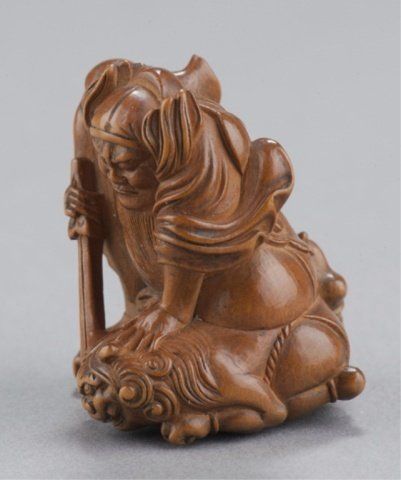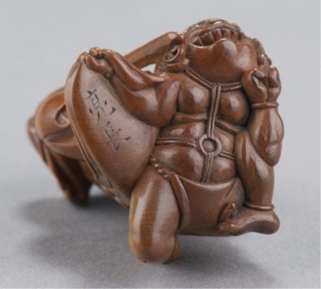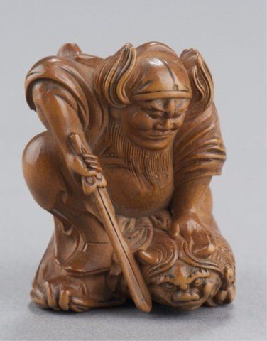 By Matsuda Sukenaga, Suketomo, Early 19th century. Shoki kneeling on an Oni and holding him down with his left hand, his right holding his sword in a threatening manner, the lightly stained Hida pine showing very slight traces of ittobori work on the back, nicely polished and showing a little wear to the front of the Oni, himotoshi uses a natural opening. Signed on the underside without reserve, Sukenaga. 1 1/2in (3.7cm).