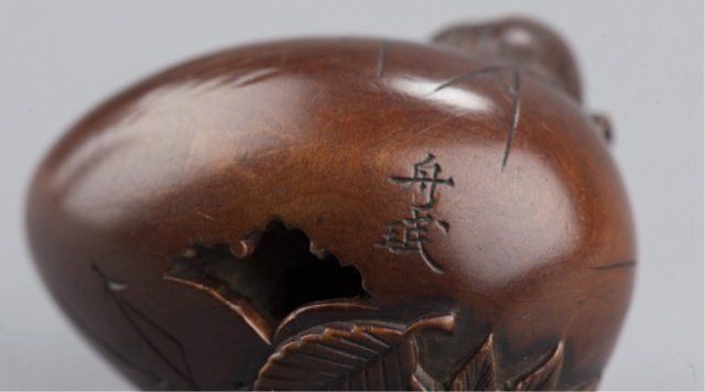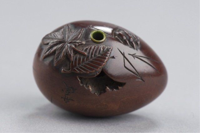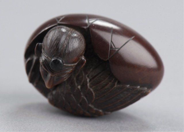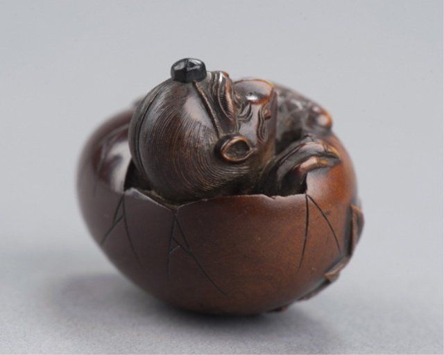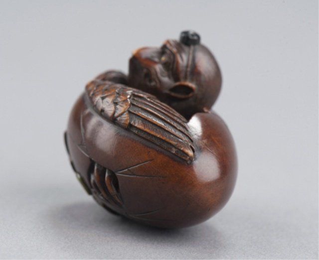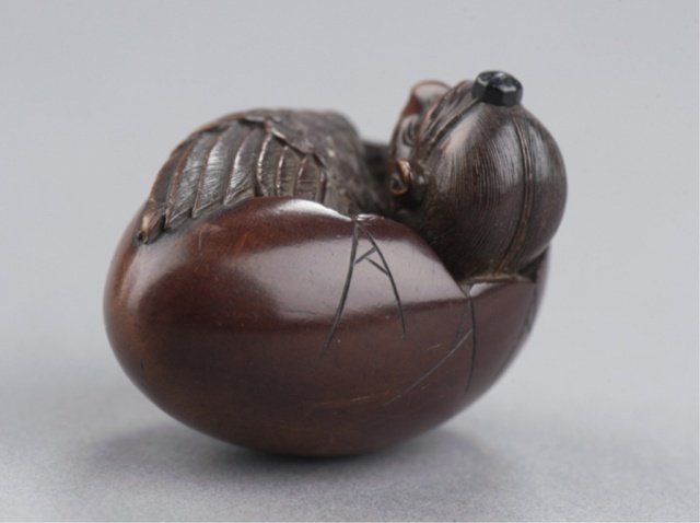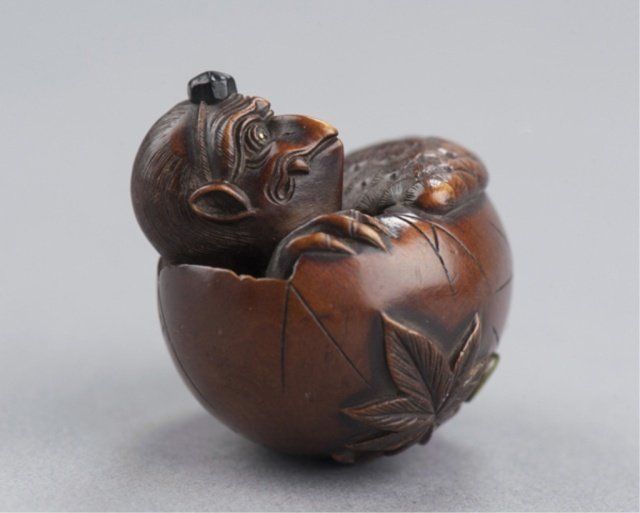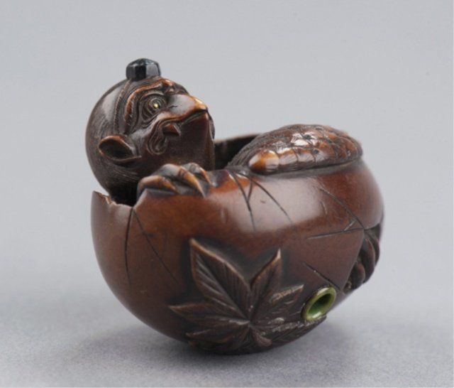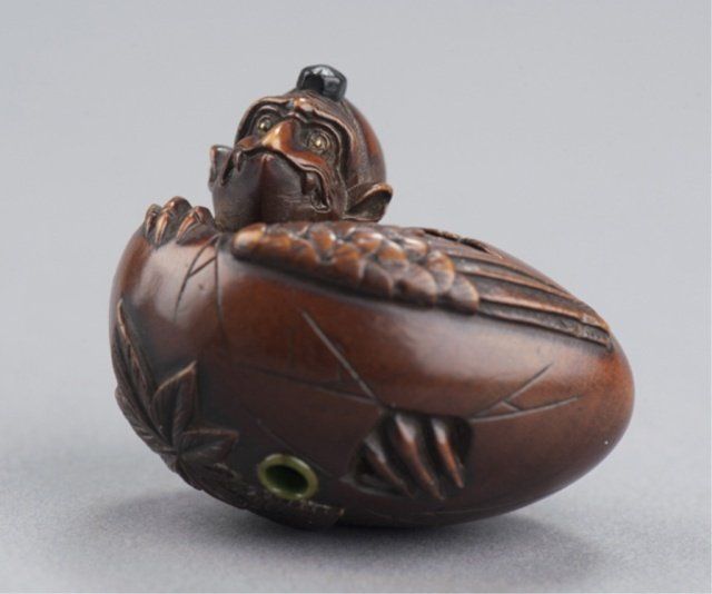 Attributed to Masa Shumin 2nd. Tokyo, Mid 19th century. , Mid 19th century. The eyes are inlaid in brass, the "cap" on the Tengu's head is of ebony, and one himotoshi is lined with green-stained ivory, the other exits through a large opening where the Tengu is breaking through the bottom of the shell. The feather work is well-carved and slightly worn There are two leaves carved on the underside, one of which is a maple and the other appears to be an elm. Signed on the side using the 2-element form of Min. 1 1/2in (3.7cm).