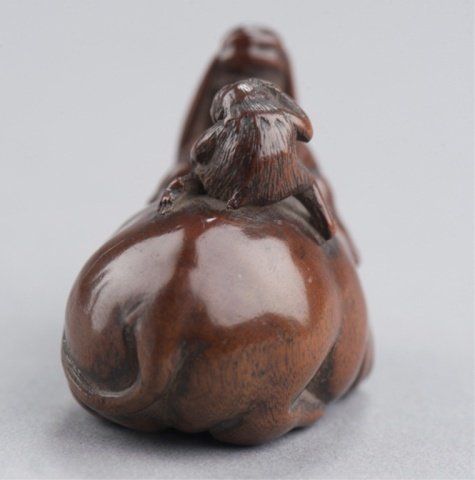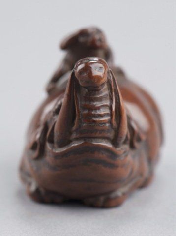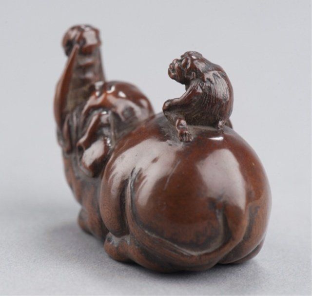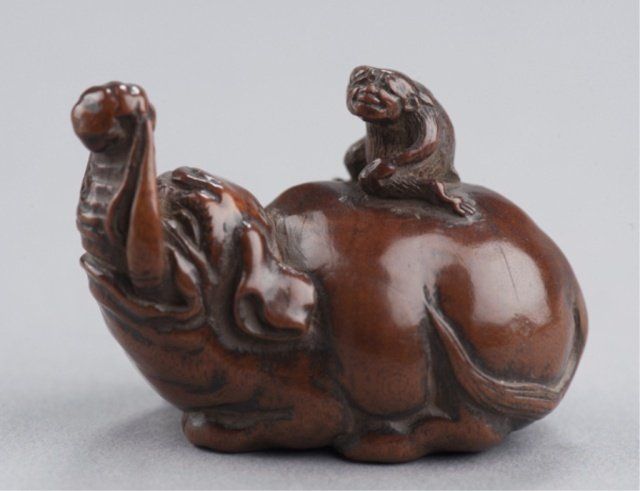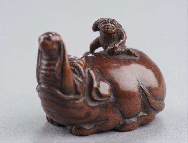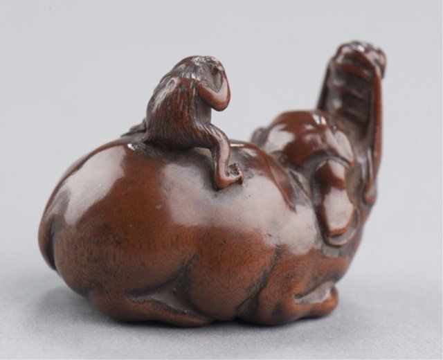 By Tametaka, Nagoya, Mid 18th century. The monkey with its right hand to its head as if peering into the distance and seated astride an en couchant Baku with an enormous girth. Signed on bottom of foot without reserve, Tametaka. 1 3/8in (3.6cm).