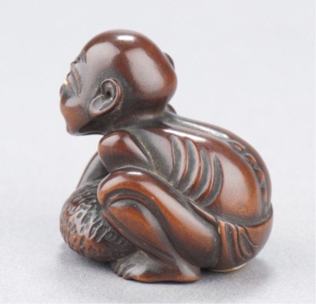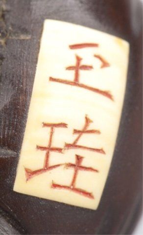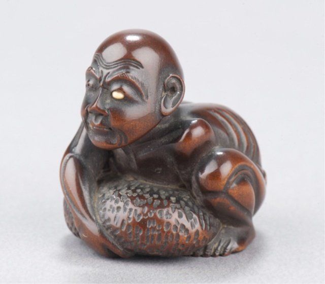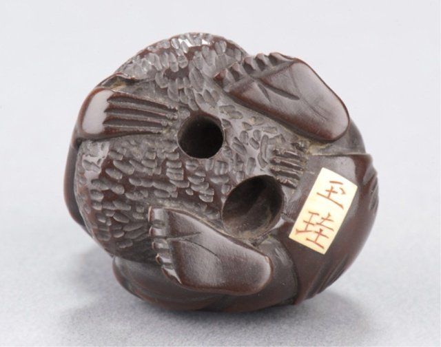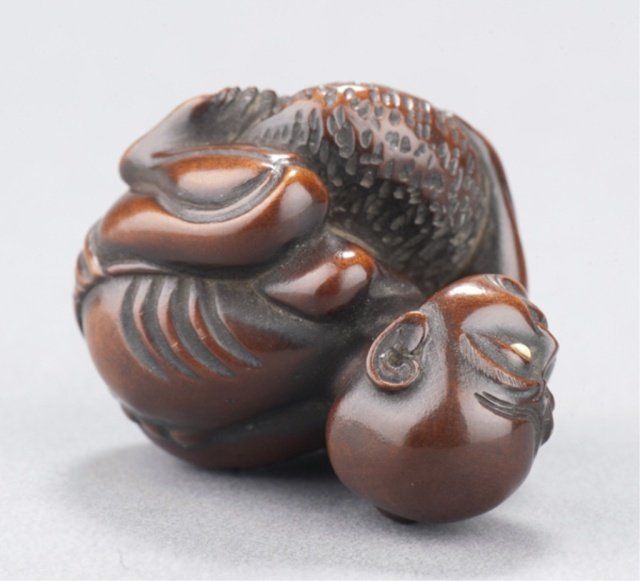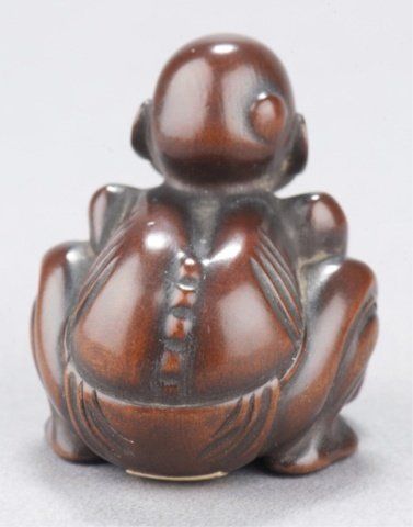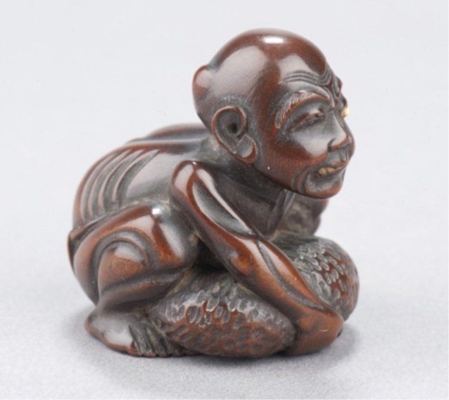 Tokyo, Mid 19th century. , Mid 19th century. With a large tumor on his scalp trying to raise himself from the ground, impeded in this effort by the weight of his hypertrophic testicle. Inscribed in inlaid ivory tablet on underside, Gyokkei. 1 3/8in (3.6cm). Provenance: Purchased from Joseph U. Seo, 1969.