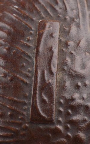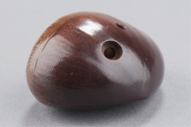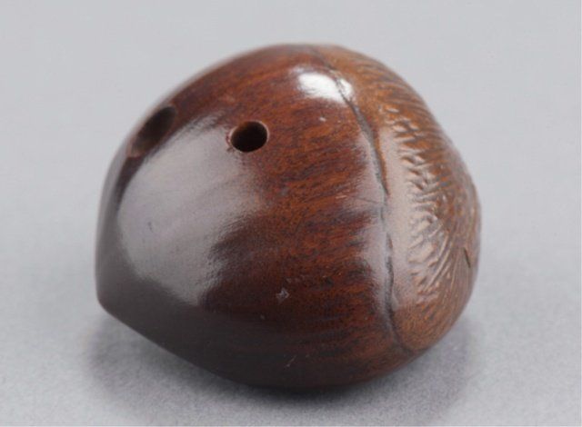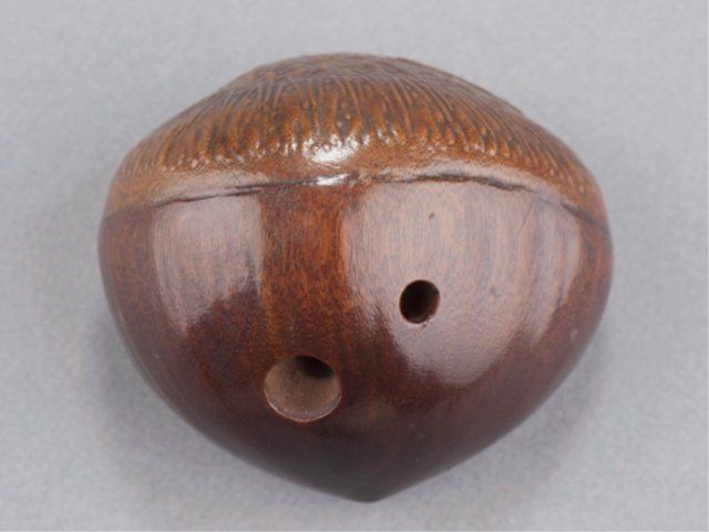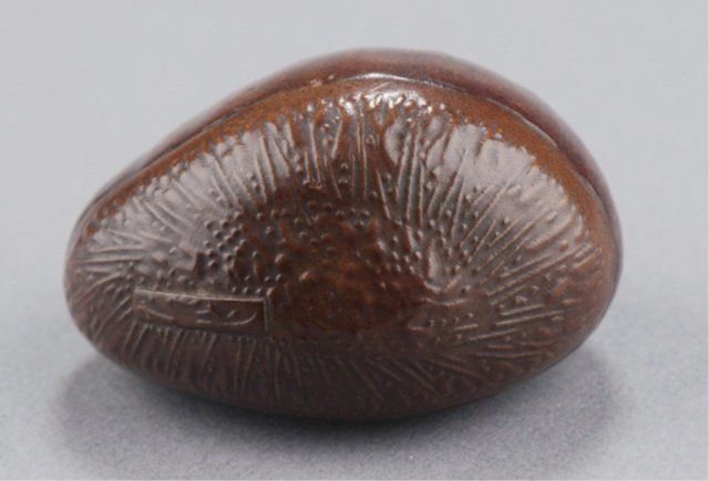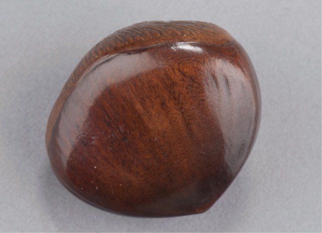 By Tadatoshi (circa 1770-1840), Nagoya, Mid 19th century. Tthe bottom half smooth, stained a dark mahogany color, and bearing the himotoshi of unequal size, the top half, realistically stained a lighter tan and entirely covered with an ukibori design of streaks and dots that simulate the texture of the cap, signed in ukibori in a polished rectangular reserve, Tadatoshi. 7/8in (2.2cm). Provenance: The signature only is reproduced in Lazarnick, page 1064.