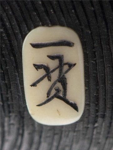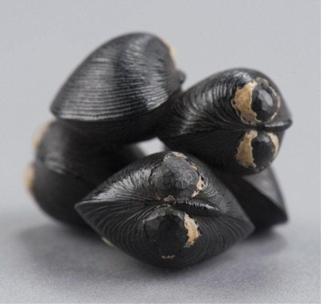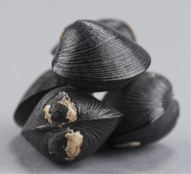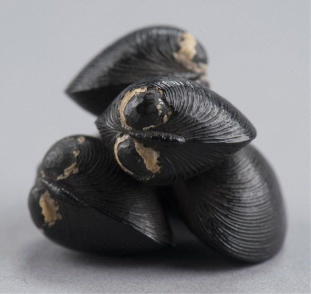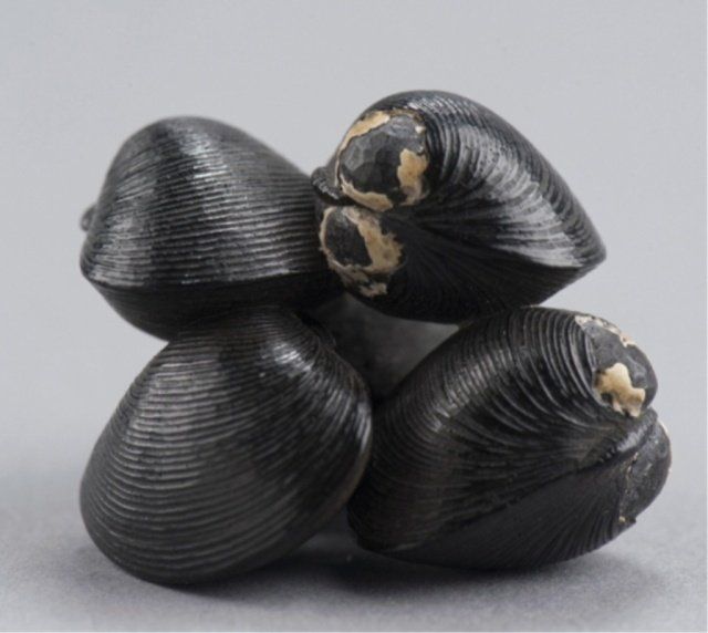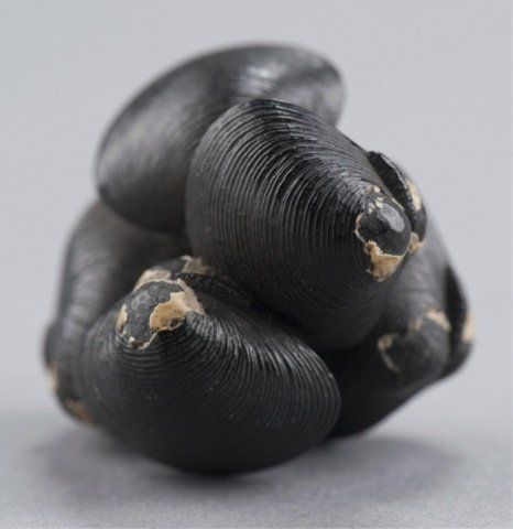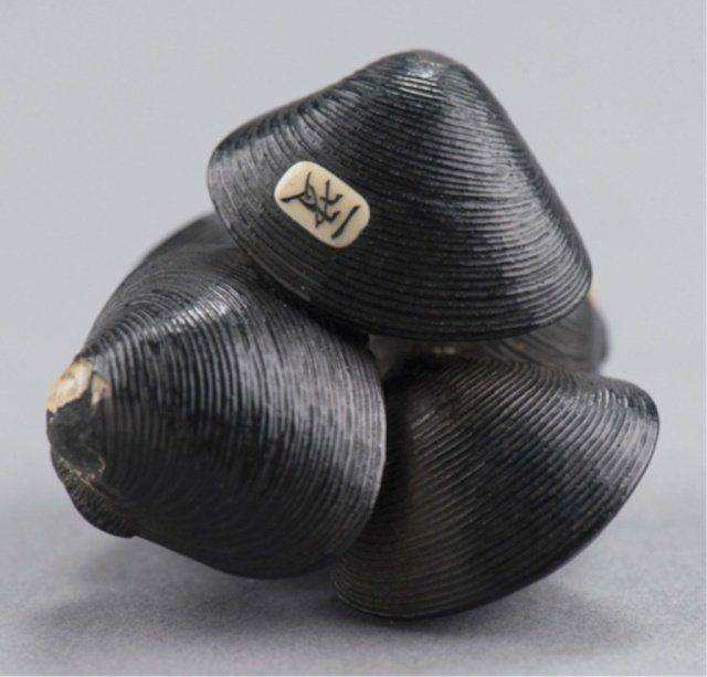 By Ikkan (1817-1893), Nagoya, Mid 19th century. Tightly closed, the spiral markings of the shells well-defined and stained black for effect, the umbos partially finished with white gesso to indicate where the periostracum has worn off. The natural openings in the design are used for the hinotoshi.Signed on an oval ivory inlaid plaque, Ikkan. 1 1/8in (2.9cm). Provenance: Ex Richards collection. Purchased from R. Koscherak, 1957.