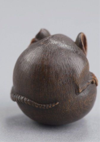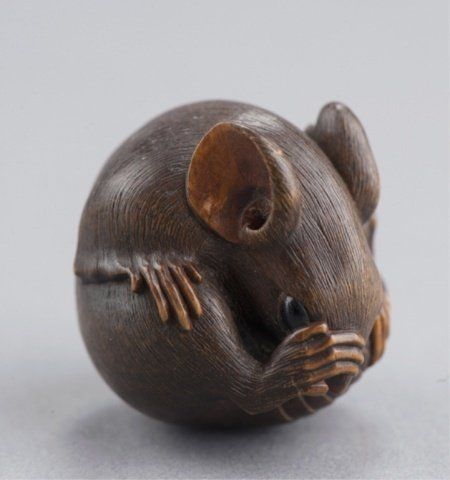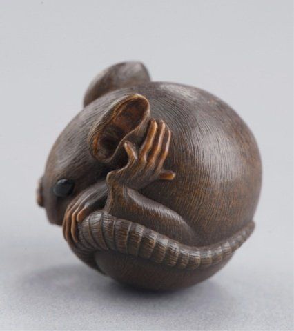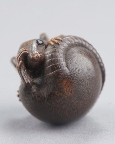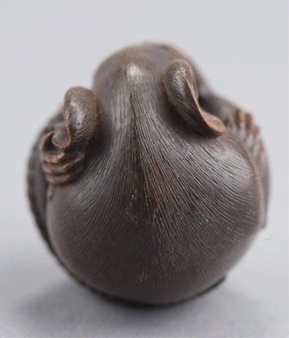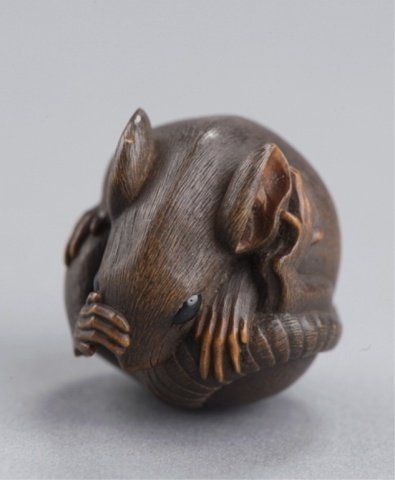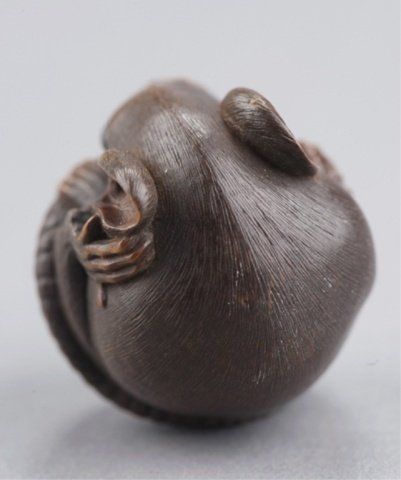 By Masakiyo, Yamada, Mid 19th century. With one paw to his ear and another holding his nose while the tail wraps around his body, he hair-work is beautifully engraved and the eyes are inlaid in dark horn. SIgned at base of tail in rectangular reserve, Masakiyo. The Masanao lineage is easily seen in this typical example of the school, especially the influence of his teacher, Masakatsu. 1 1/4in (3.3cm). Provenance: Purchased at Parke-Bernet, New York, February 7, 1951.