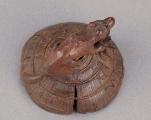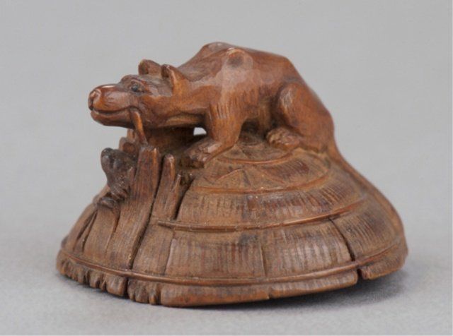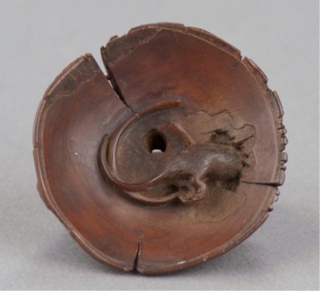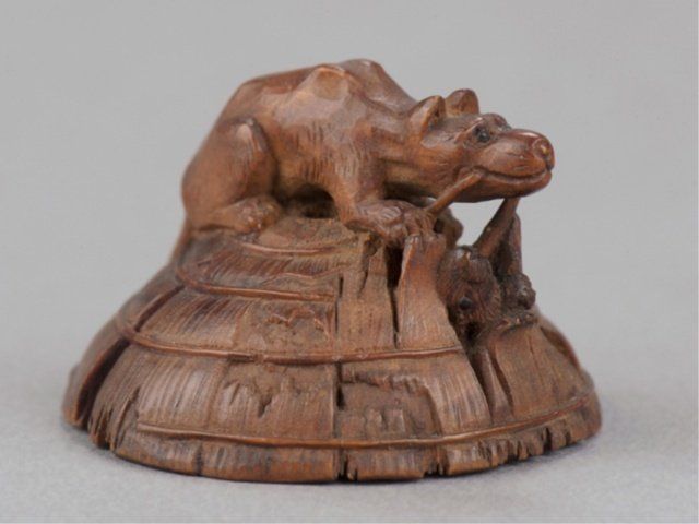 By Bazan (d.1879), Nagoya, Mid 19th century. With a captured a rat under a straw hat. The rat is partially coming through a hole in the hat and the fox has the rat's tail in its mouth where is has protruded through another hole. Signed on the side, Bazan. 1in (2.5cm). Provenance: Christie's, New York, March 21, 1985; Lot 760. The Mary Louise O'Brien Collection.