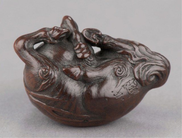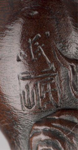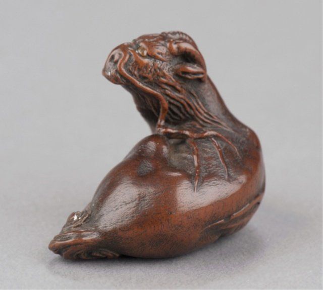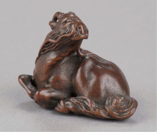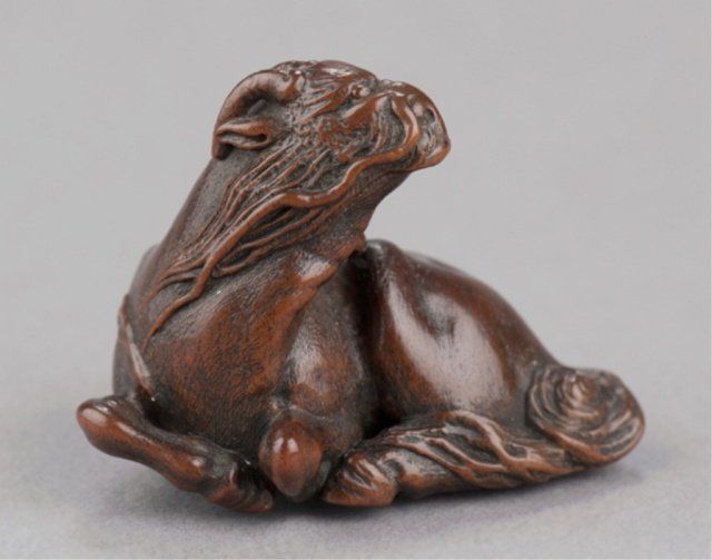 By Ichimin, Nagoya, Early 19th century. A recumbent two-horned Kirin, eyes inlaid in horn(?), rich reddish Nagoya coloring, fine hair-work with leathery skin and flames carved in relief. Signed on the underside, Ichimin, plus a seal, Ichimin.1 3/8in (3.4cm). Provenance: Ex Richards collection. Illustrated in the The MCI page 206. Purchased from R. Koscherak, 1957.