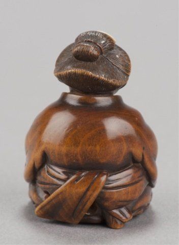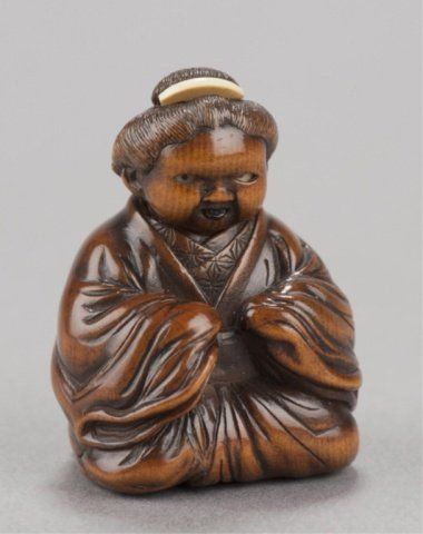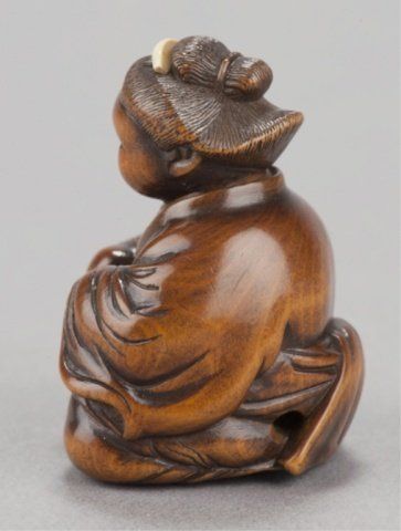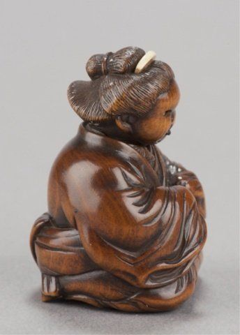 By Tanaka Minko (1735-1816), Tsu, Early 19th century. Wearing a kimono and seated with her hands under the garment and pulling it together, her feet show under the kimono but without erotic detail, her eyes are double-inlaid in ivory with black pupils, her haircomb is also inlaid in ivory and her tongue sticks out and is inlaid in ebony. Signed on the underside, Minko. 1 5/8in (4.1cm). Provenance: Ex Richards collection. Purchased from R. Koscherak, 1957.