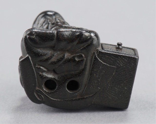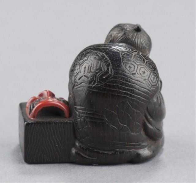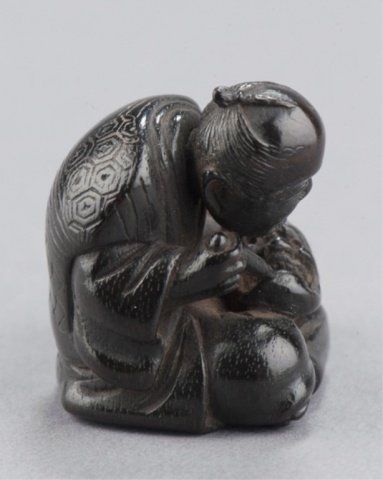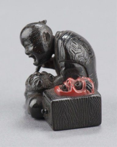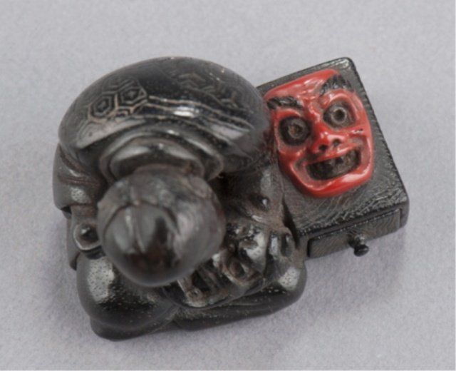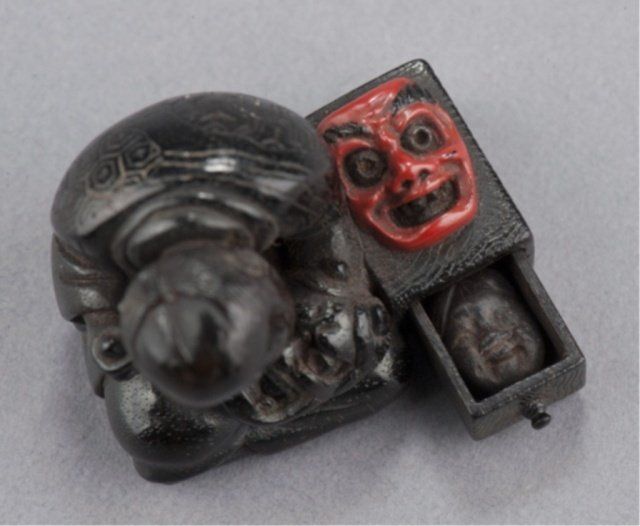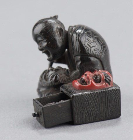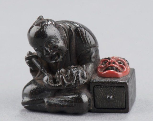 By Ryukusai Jugyoku 1st, Tokyo, Early 19th century. , Early 19th century. Sitting cross-legged and making a Hannya mask, his face taking on the expression of the mask, a cabinet rests at his side with a loose drawer containing an Uzume mask, and a red lacquer oni mask on top. Signed on the underside, Jugyoku. 1in (2.7cm). Provenance: Ex M.T. Hindson collection, Sotheby's, London, June 26, 1967; Lot 53. Ex Gilbertson collection. Illustrated in Davey, #344, page 119.