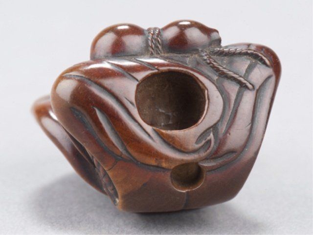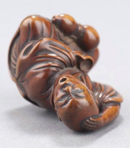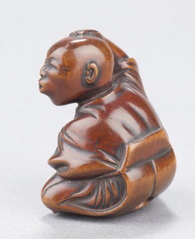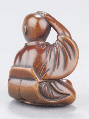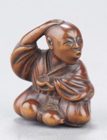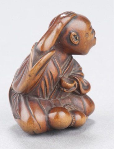 Mid 19th century. Seated with his right hand on top of his head, the left holding out a small bowl for alms, a gourd with rope attached sits in front of him, good himotoshi on the bottom, one especially large. Unsigned 1 5/8in (4cm).