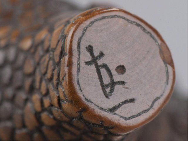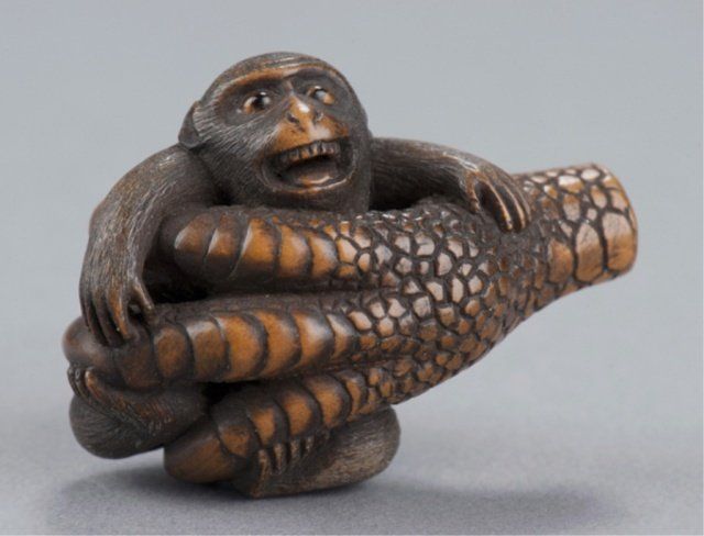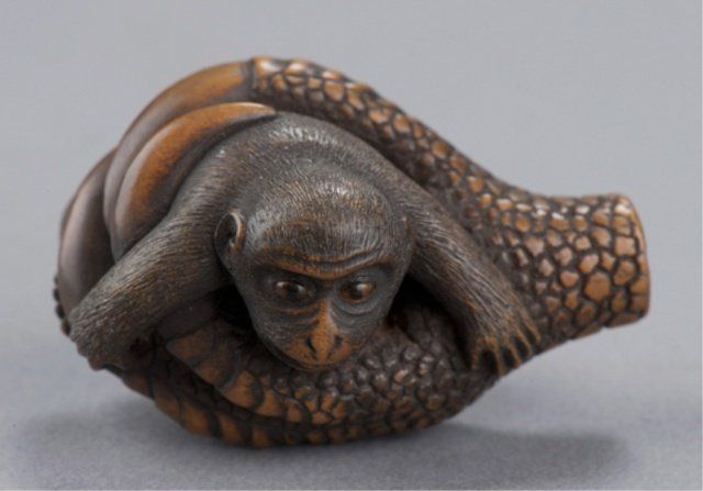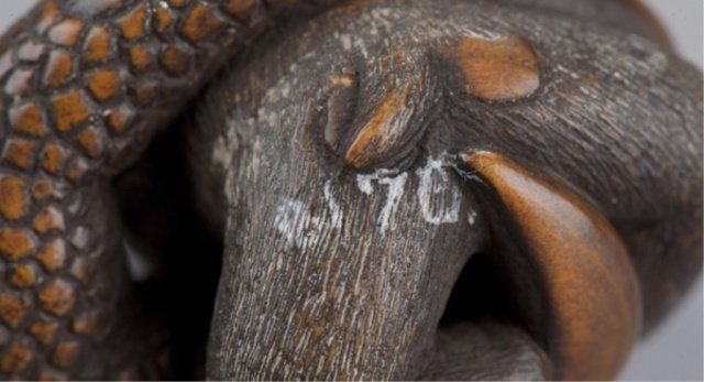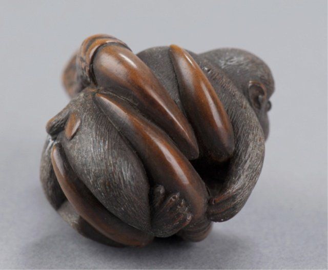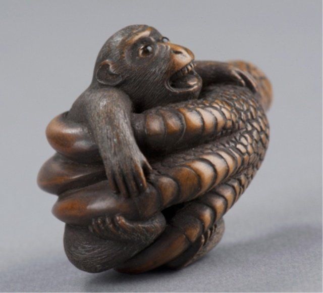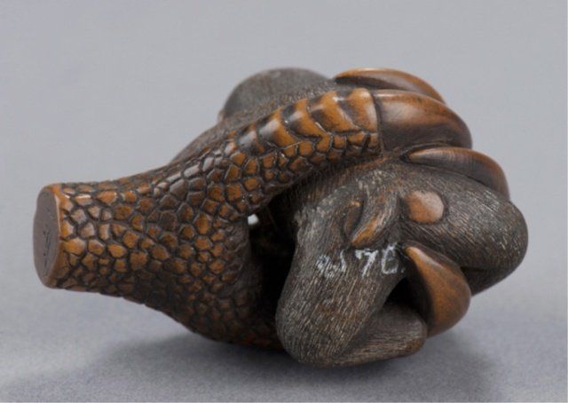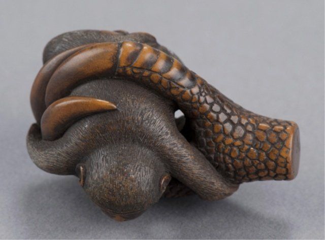 By Kano Tomokazu, Gifu, Early 19th century. The claw is severed at the ankle, the small creature writhing in a terrified manner to escape, the eyes inlaid in translucent amber with dark pupils, hair-work finely detailed, himotoshi use a natural opening. Signed on the end without reserve, Tomokazu. Traces of an old collector's number appear on the back in white paint. 1 3/4in (4.6cm). Provenance: Sotheby's, London, June 14, 1972; Lot 8.