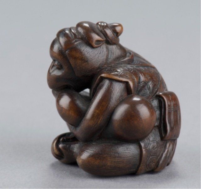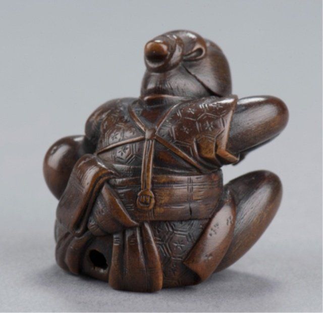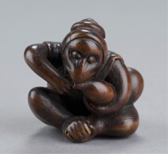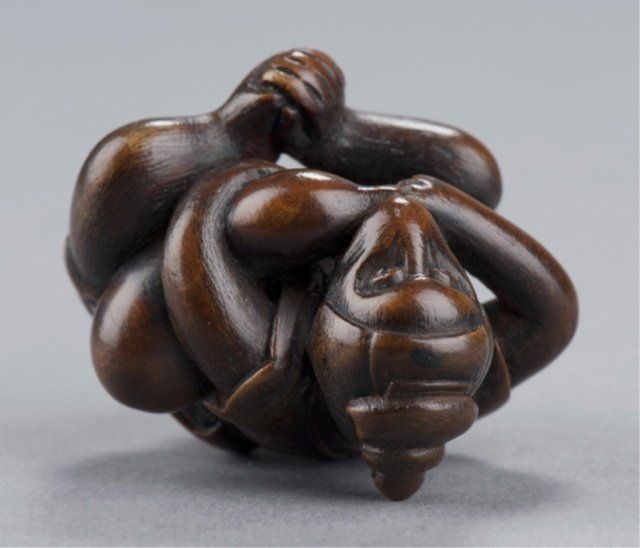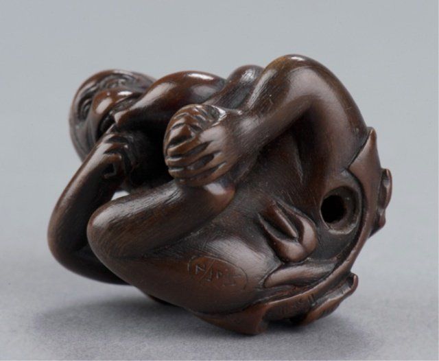By Masatami, Nagoya, Mid 19th century. Drinking sake from a large gourd and desperately trying to extricate his finger from the mouth of the jug. Signed in an oval reserve, Masatami. 1 1/2in (3.8cm). Provenance: Purchased from Joseph U. Seo, 1958.