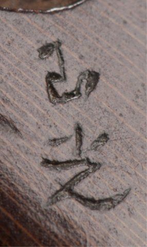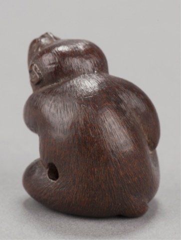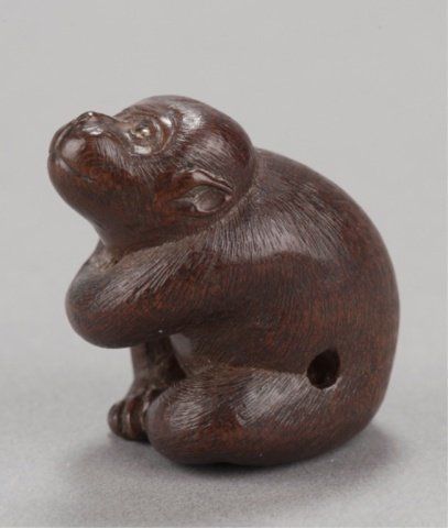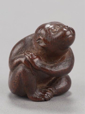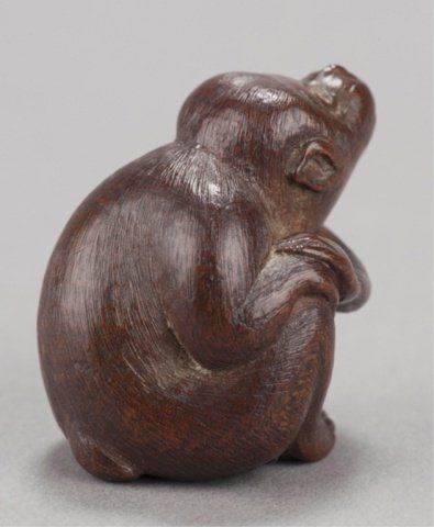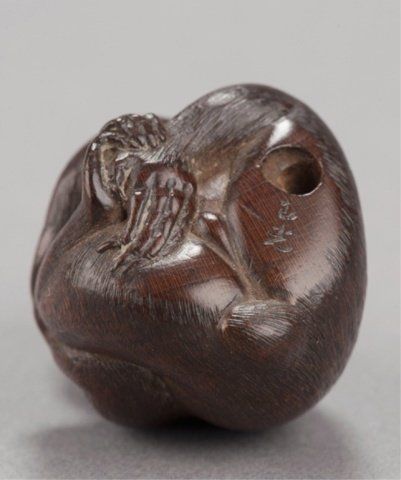 Attributed to Isshinsai Masamitsu II, Yamada, Mid 19th century. Seated with his front hands clasped over his right knee while he gazes upwards, with nice hair-work, and inlaid glass eyes. Signed on underside without reserve, Masamitsu. 1 3/8in (3.3cm). Provenance: Purchased at Parke-Bernet, New York, February 7, 1951.