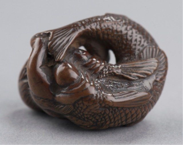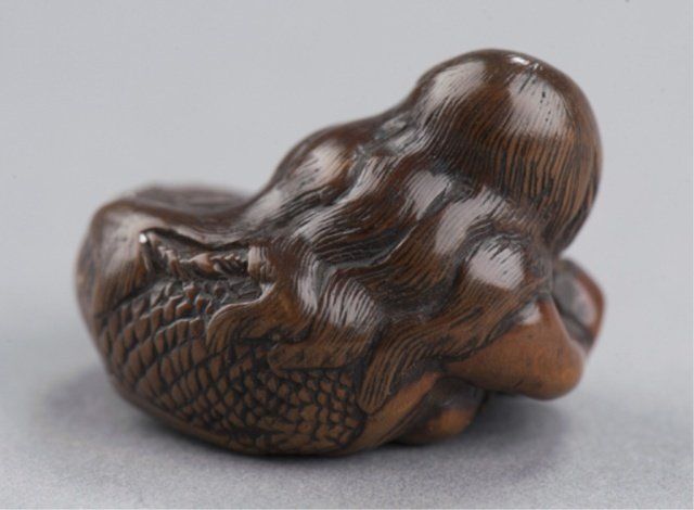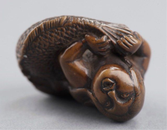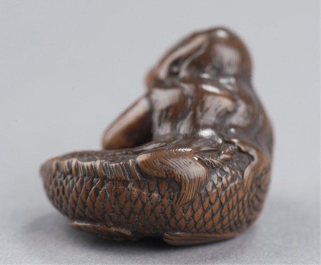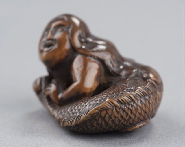 By Tomin, School of Minko, Tsu, Late 18th century. Seated, looking up with her tail curled around to rest under her hands, her scales and flowing hair are well defined, some wear and patinated to a rich golden brown color. Signed between a pair of pectoral fins on the underside in ukibori without reserve, Tomin.1 1/8in (2.7cm). Provenance: Sotheby's, New York, October 6, 1982.