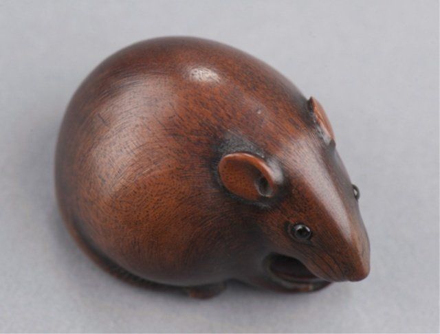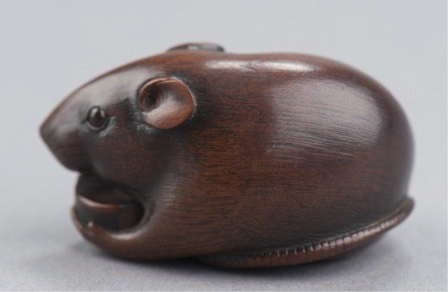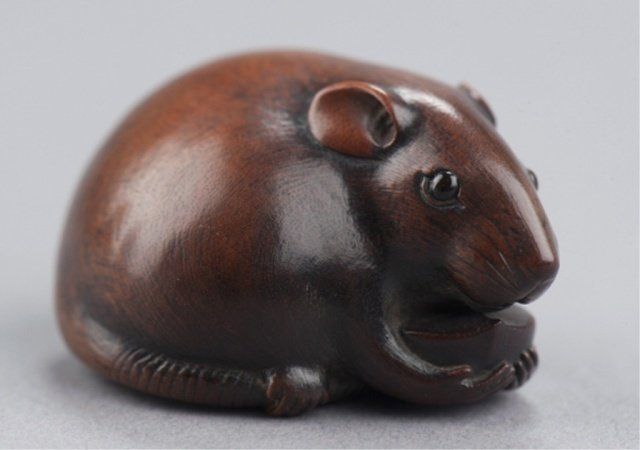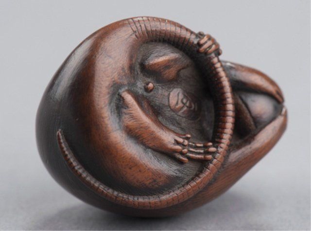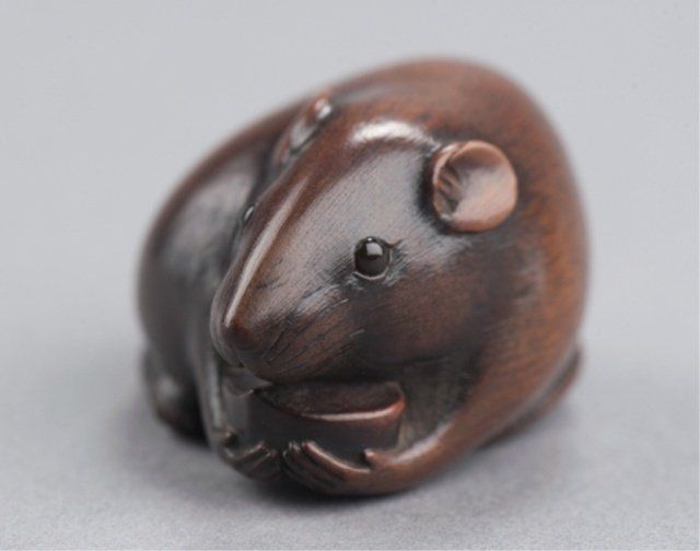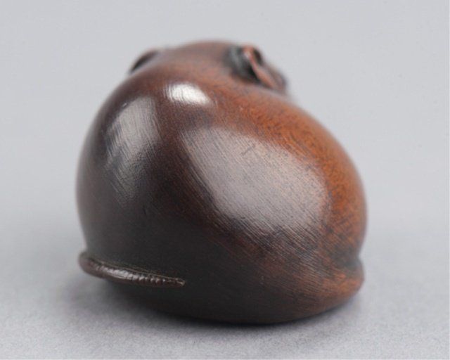 By Kano Tomokazu, Gifu, Early 19th century. Sitting with its tail curled underneath while clutching a chestnut with its front paws, eyes inlaid with dark horn, the lower two incisors with ivory, the reddish hue of the wood typical of origins near Nagoya. Signeed under the tail in an oval reserve, Tomokazu. 1in (2.4cm).