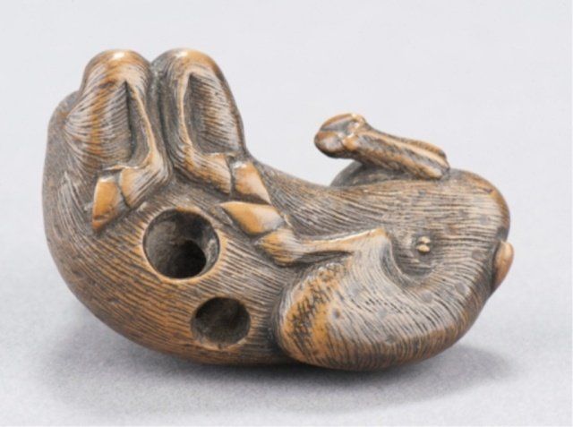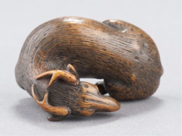Attributed to the Garaku School, Osaka, , Early 19th century. Head turned back over its body and the legs tucked up underneath. Nicely worn, decently large himotoshi, eyes inlaid in black, the hair-work interrupted by the spotted markings on its fur. 1 7/8in (4.7cm).