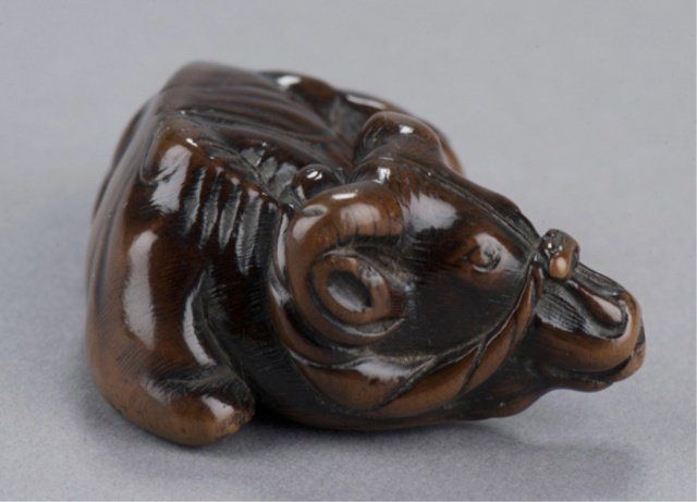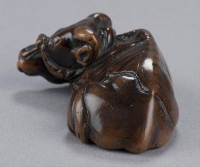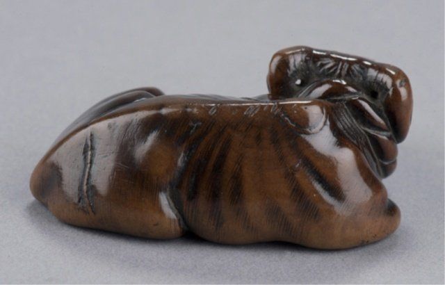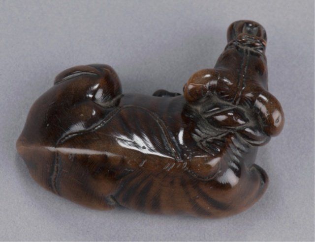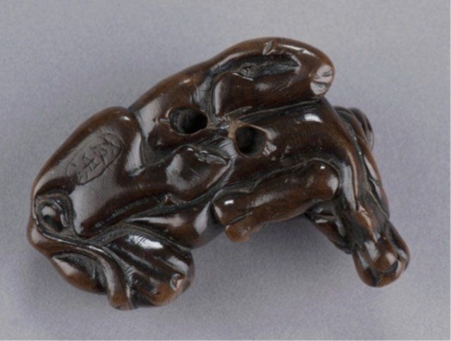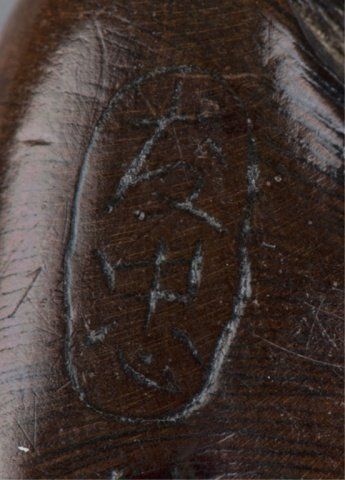 Inscribed Tomotada, Kyoto, , Early 19th century. Eyes inlaid in black, deeply stained a dark brown, well-worn and patinated. Inscribed on the underside in an oval reserve, Tomotada. 2 1/4in (5.6cm). Provenance: Ex Richards collection.Purchased from R. Koscherak, 1958.