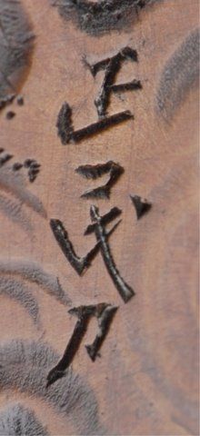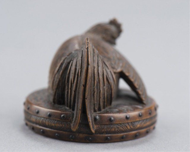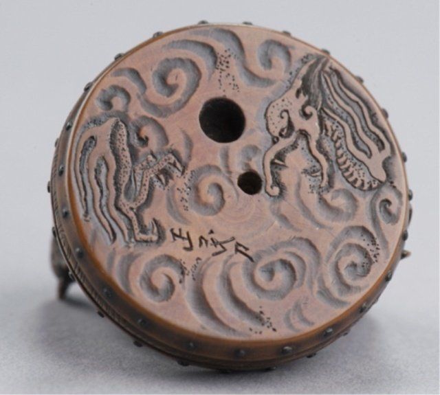 By (Koya?) Masatami, Nagoya, Mid 19th century. Sitting on a drum, the bottom of the drum is engraved with a design of clouds and dragons. Signed on the underside, Masatami. 1 3/8in (3.4cm).