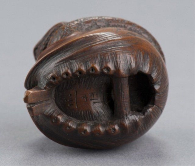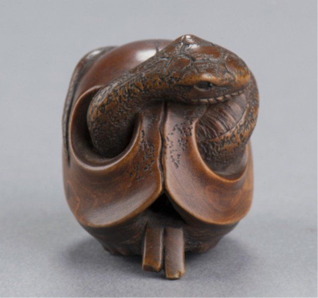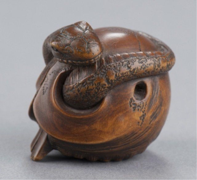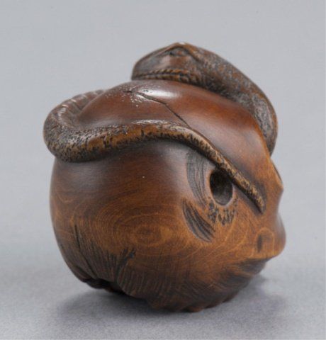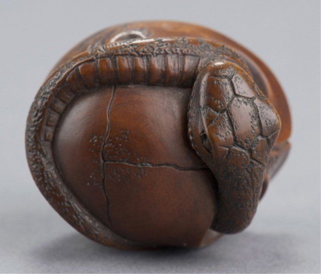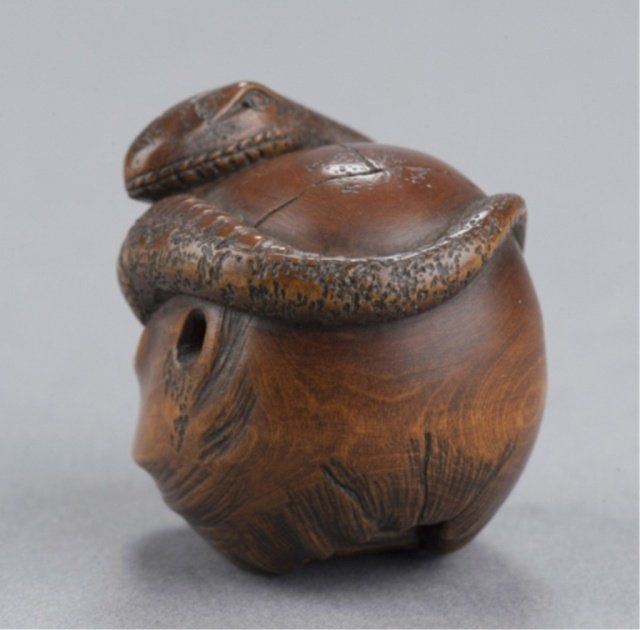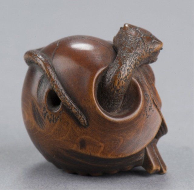 By Masanao III or II, Yamada, Early 20th century. The orbital sockets of skull are pierced by the coils of the snake, eyes inlaid in black, the pitted skin of the snake providing a nice contrast to the smoothly sculpted surface of the skull. Signed on the underside in a polished reserve, Masanao. 1 1/4in (3.3cm). Provenance: Purchased from Joseph U. Seo, 1968.