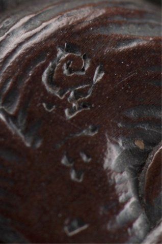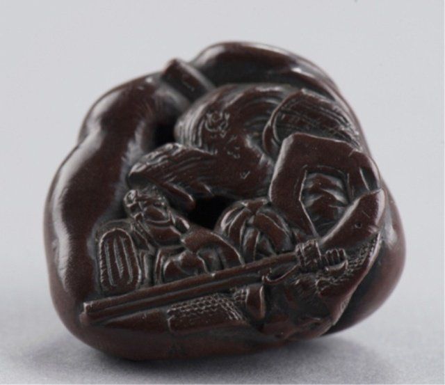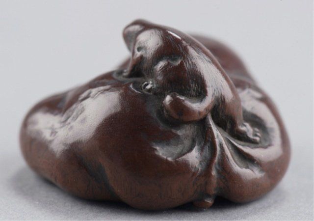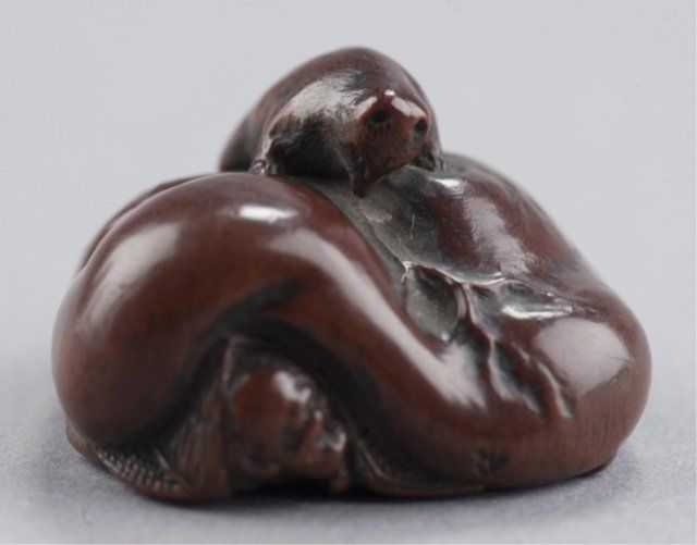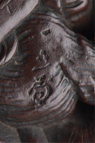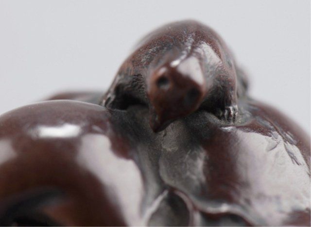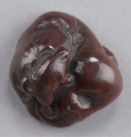By Ittan, Nagoya, Mid 19th century. Atop his enormous, deeply veined, scrotum under which is compressed a hunter with his rifle. Signed on the underside, Ittan, plus kakihan. A similar model is in the Baur Collection, see Figure C1112. 7/8in (2.2cm).