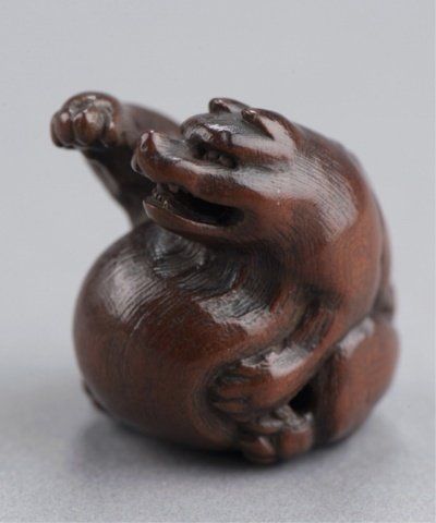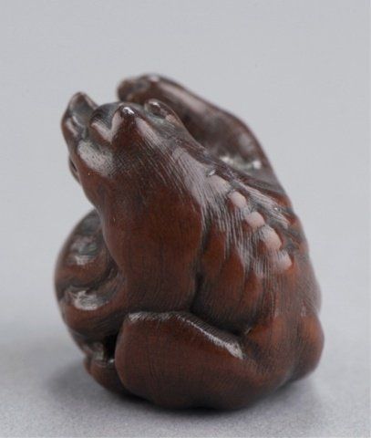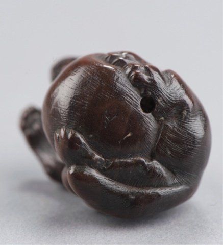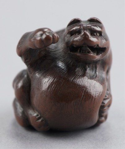 Signed Masakazu, Nagoya, Mid 19th century. With open mouth and his right arm raised in anger, nicely stained a warm reddish hue. Signed on the underside, Masakazu 1 1/4in (3.2cm). Provenance: Purchased in Tokyo, 1951.