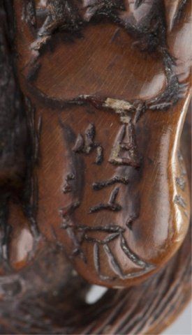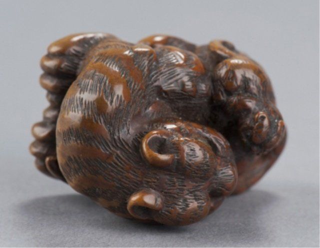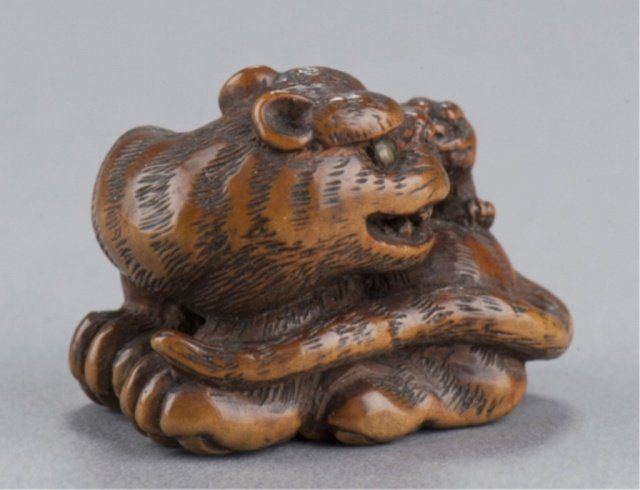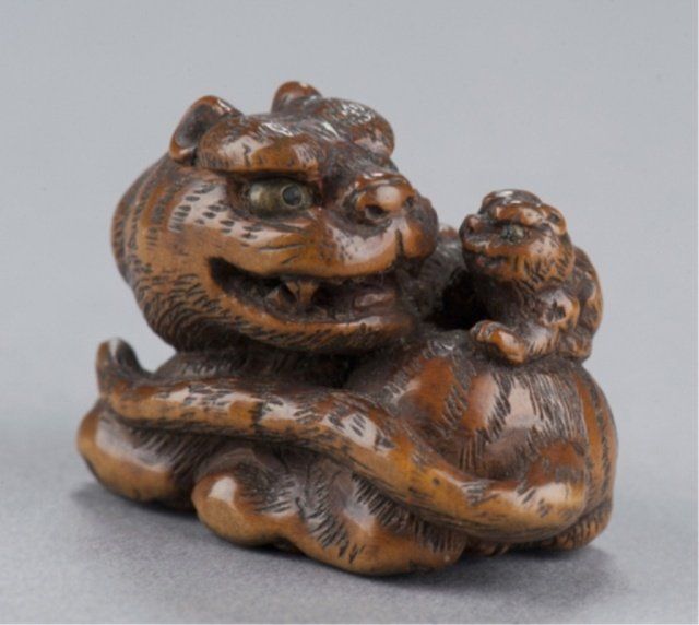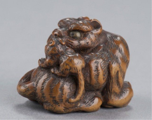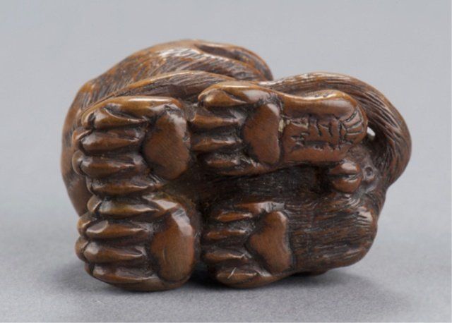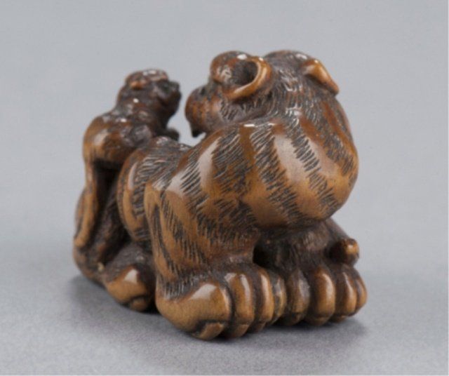 By Tanaka Minko (1735-1816), Tsu, Late 18th century. Looking around to his left as he sits snarling with his tail curled around his body and his cub seated on his haunch, eyes of both inlaid in brass with black pupils, typical large bushy eyebrows and enormous paws. Nicely worn and patinated, himotoshi carved between the front paws. Signed under the left rear paw, Minko, plus kakihan. 1 1/8in (3cm).
