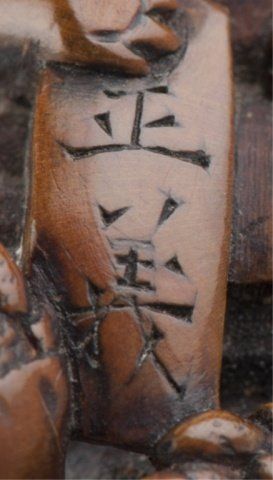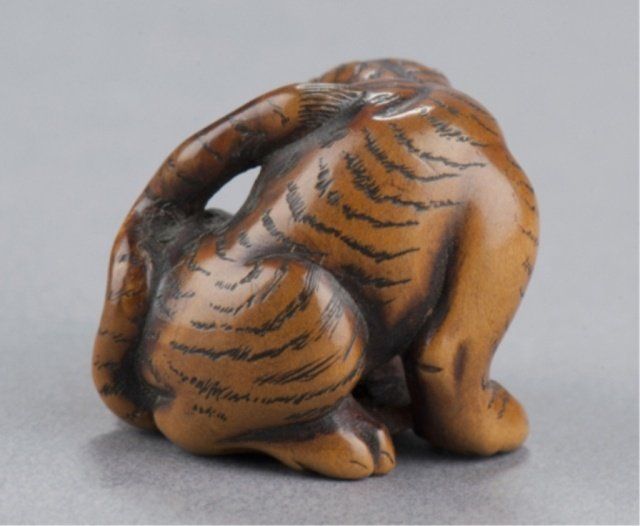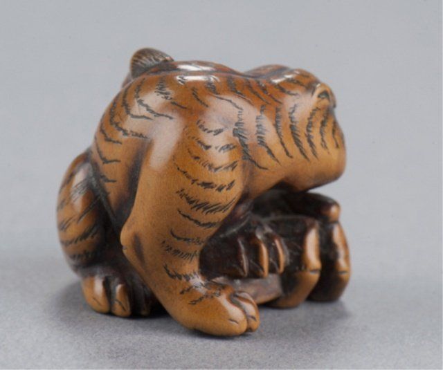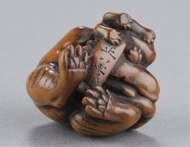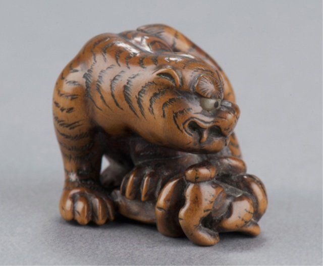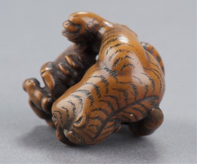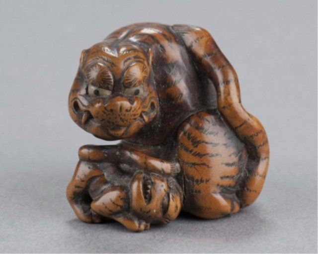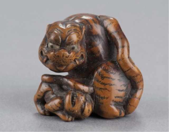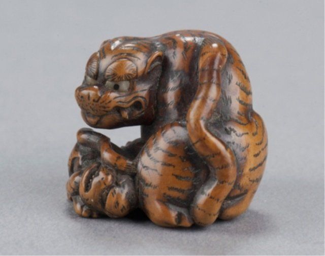 By Sato Masayoshi (1819-1865), Nagoya, Mid 19th century. She crouches above cub rolling on it's side at her feet, the eyes are double-inlaid in horn, black pupils on bulging grayish-yellow eyeballs. Signed on a rectangular plaque held between the claws of the tigress, Masayoshi. 1in (2.7cm). Provenance: Ex Scott Meredith collection.