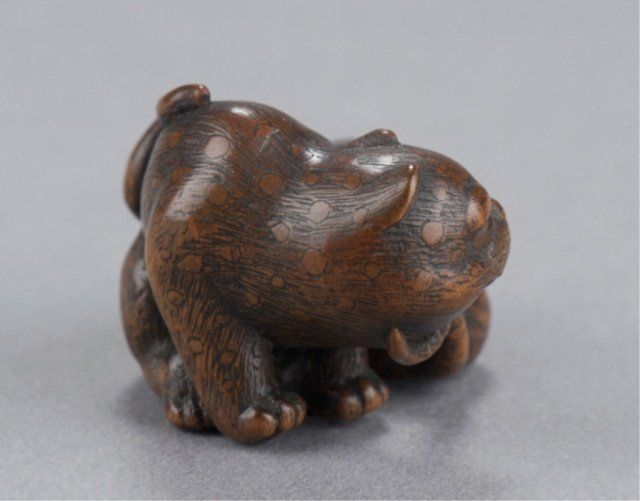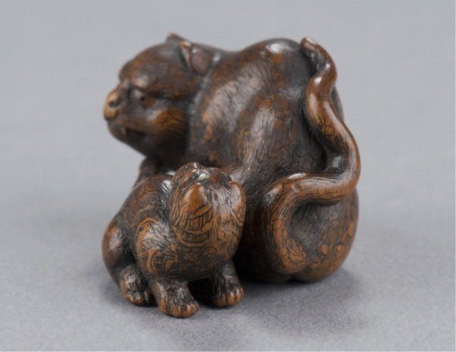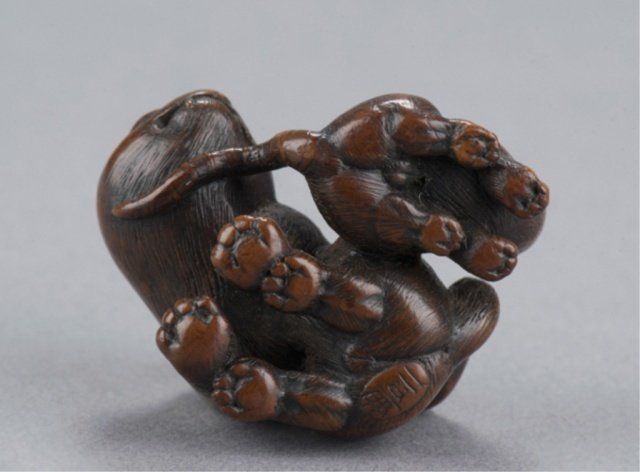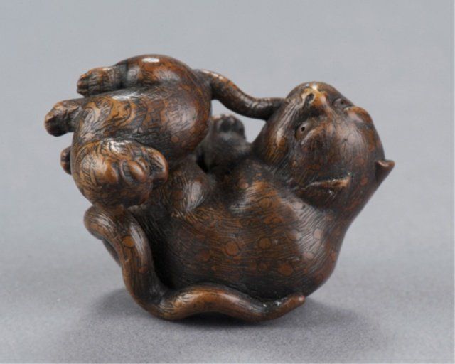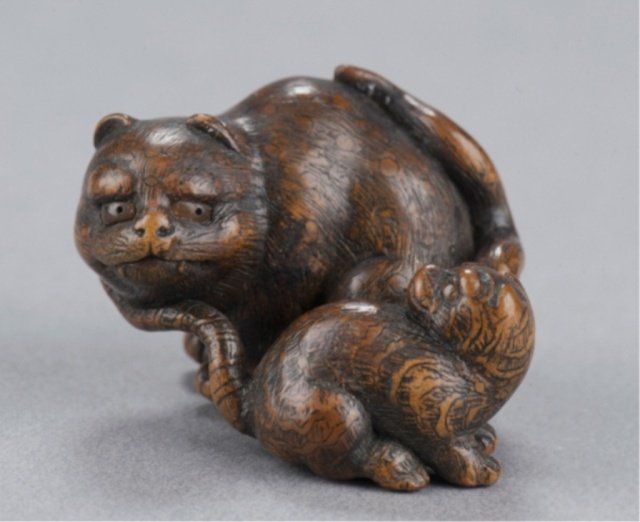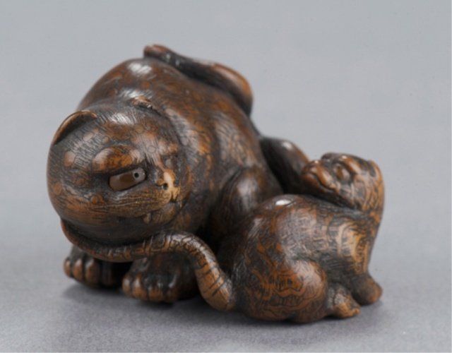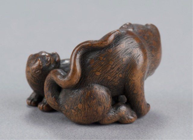 By Toyokazu, School of Toyomasa, Mid 19th century. The mother crouching and turning her head to the left to gaze at her cub who also crouches with its tail passing under her chin, the wood is of good color and eyes are well inlaid in translucent horn. The adult appears with spots rather than stripes. Signed on the underside in a polished oval reserve, Toyokazu. 1in (2.4cm). Provenance: Sotheby's, London, July, 26, 1967; Lot 391.
