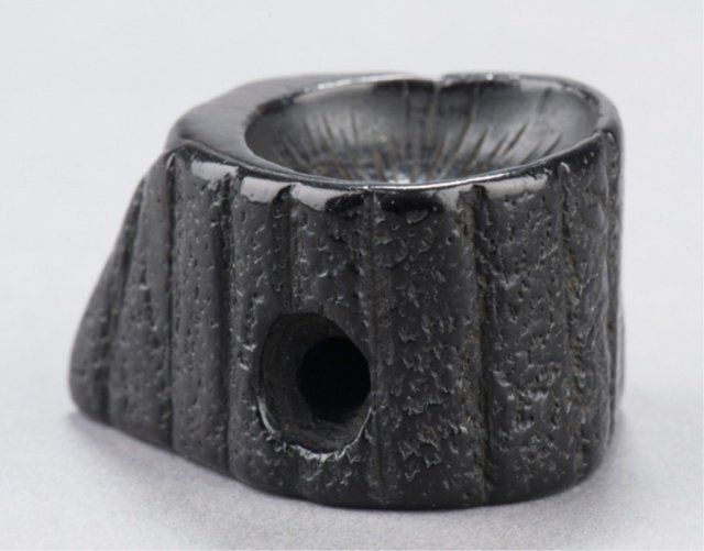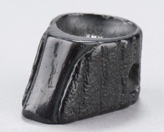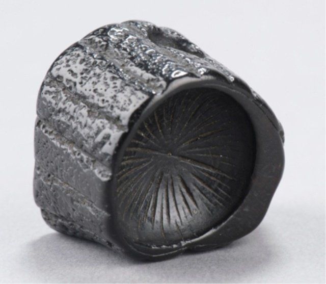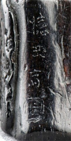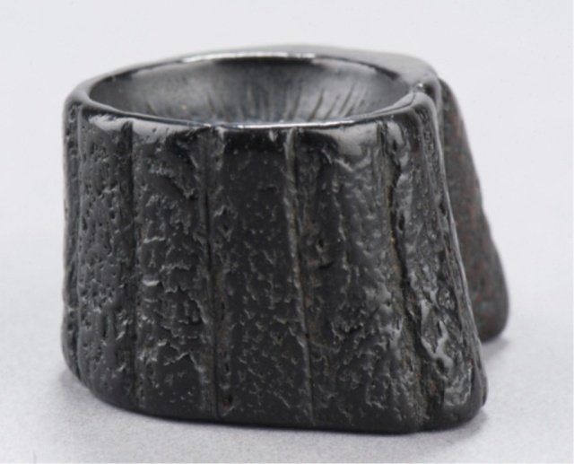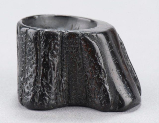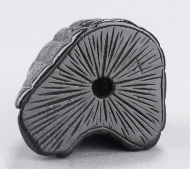 Attributed to Kaigyokusai Masatsugu, Osaka, , Mid 19th century. In the shape of a truncated tree trunk, the top concave with striations, the bottom with a himotoshi in the center and a sunburst pattern of engraved lines radiating outwards. The kaki wood has been stained almost black but traces of a lighter golden vein can be seen on one side. Signed on side, Kaigyokusai, plus a square seal, Masatsugu, in double reserve. 1 1/8in (2.8cm).