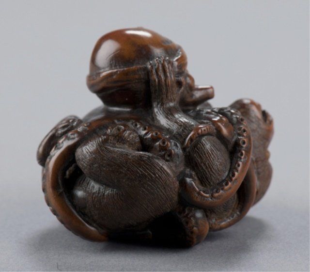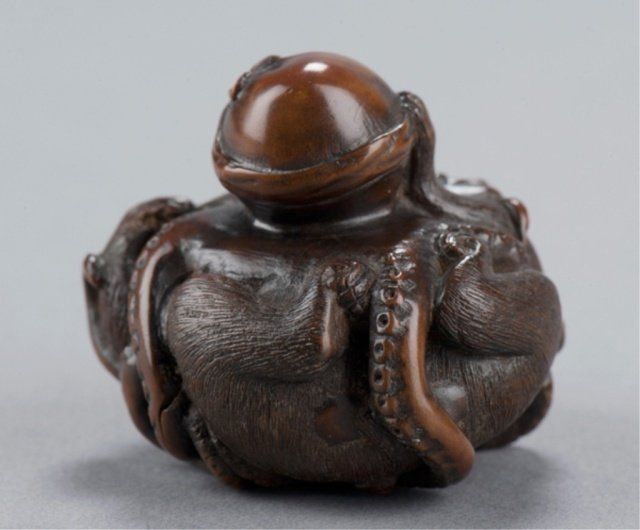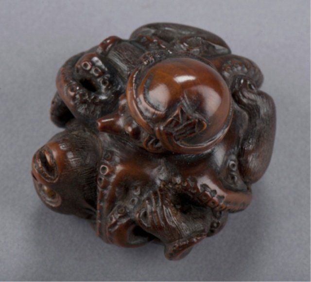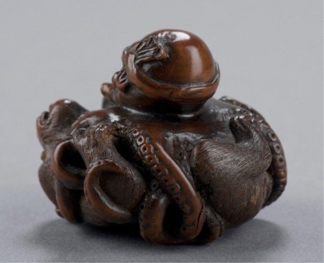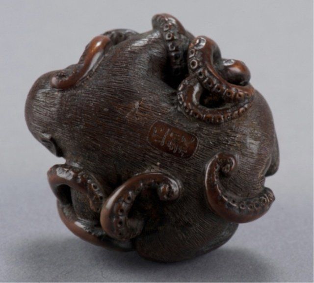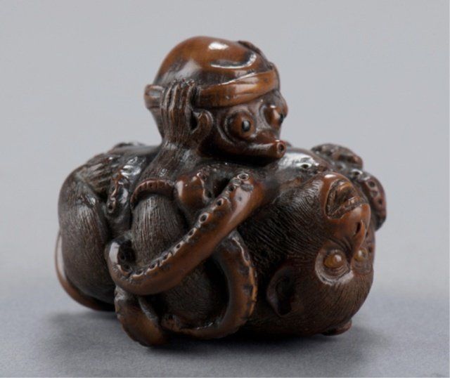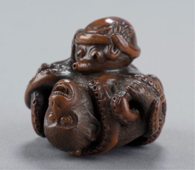 By Toyosai Masachika, Tokyo, Mid 19th century. , Mid 19th century. The pair fighting with the octopus having gotten the upper hand judging from the expression of the monkey. The pupils of the octopus are inlaid in black and those of the monkey in horn (or agate), signed on the underside in a polished oval reserve, . Tomochika school. 1 1/2in (3.7cm). Provenance: Sotheby's, London, November 3, 1969; Lot 240. Illustrated Lazarnick page 700.