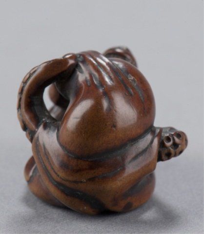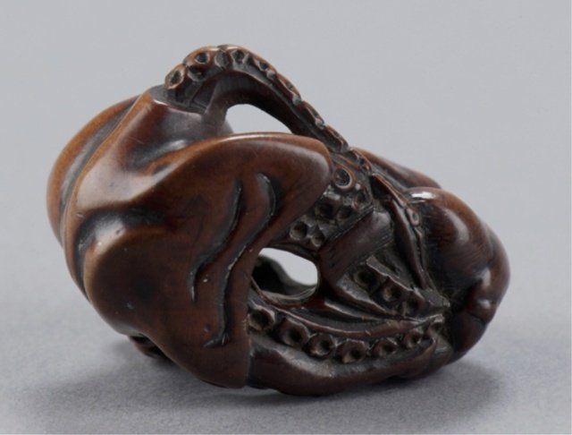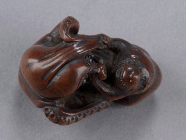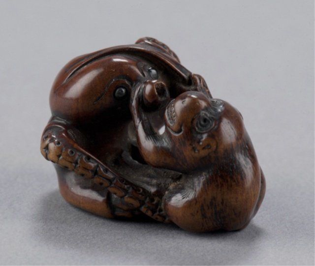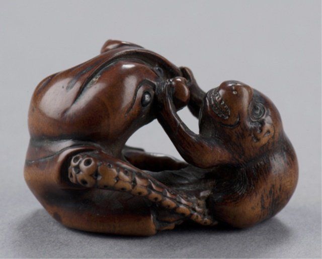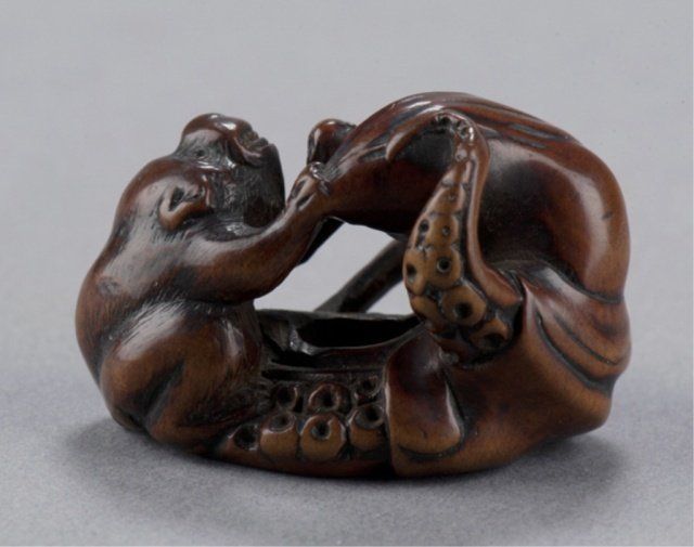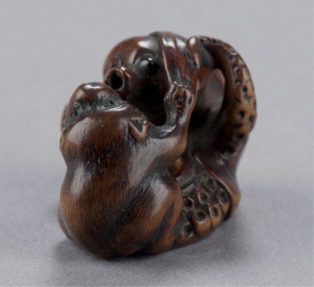 Late 18th century. Fighting in close contact, the monkey with teeth bared grasps the proboscis of the octopus with both hands, The eyes of both inlaid in black, well-worn with appropriate damage for its age. Unsigned. 1in (2.5cm).