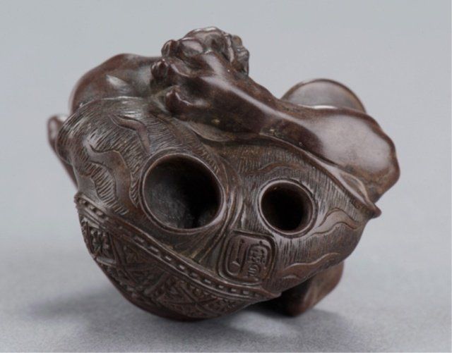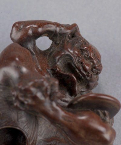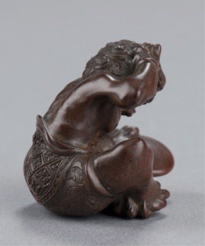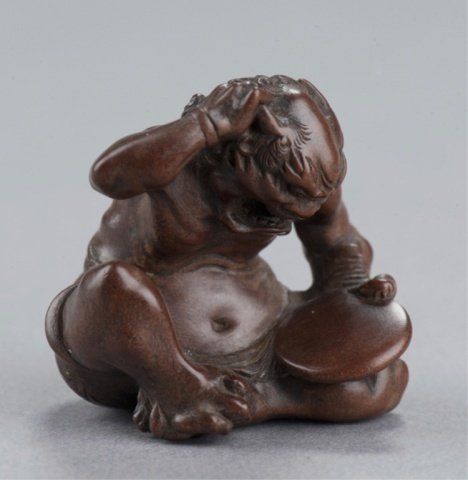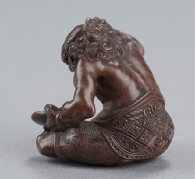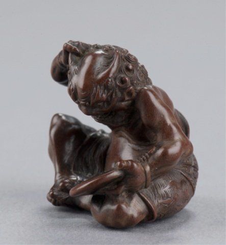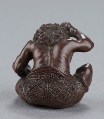 By Hozan. Mid 19th century. Sitting cross-legged in the process of cutting off his horn, he gazes at a mirror. Musculature is well defined as are his curly hair and the diaperwear pattern on his tiger skin loin cloth. Signed on the underside using a seal within a square reserve, Hozan. 1 1/4in (3.1cm).