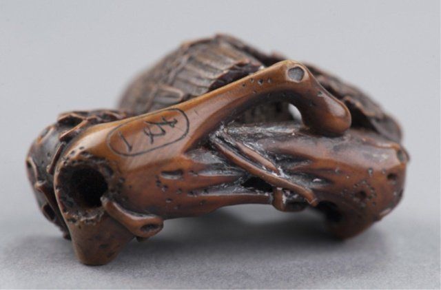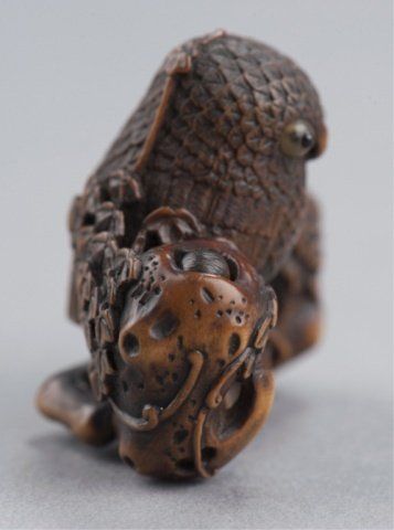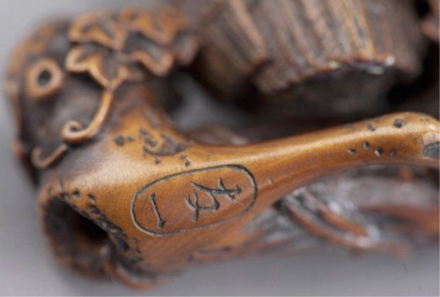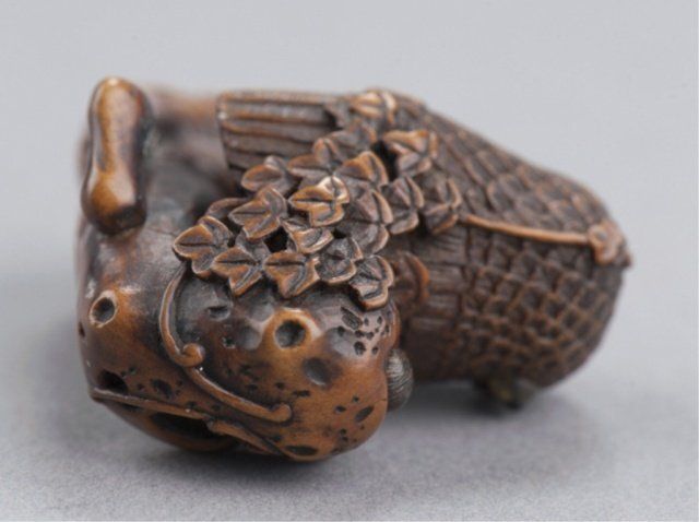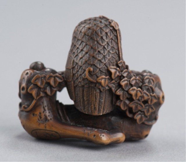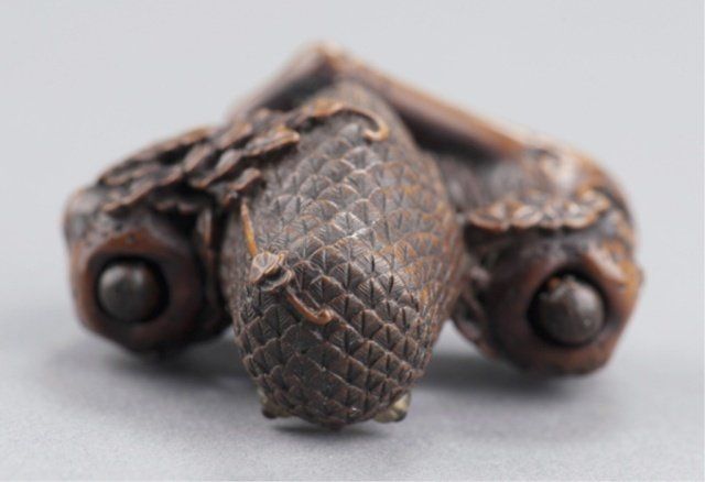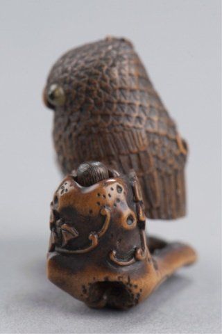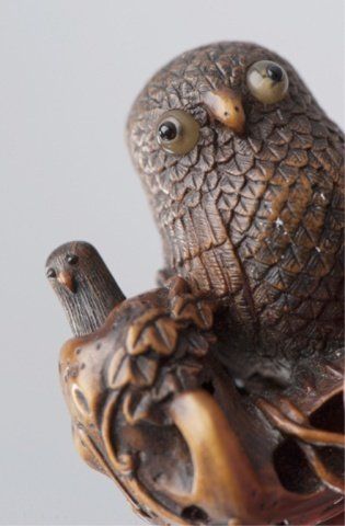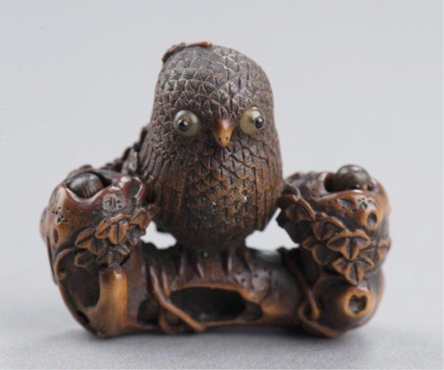 By Kano Tomokazu, Gifu, Mid 19th century. Perched on a branch, eyes double-inlaid in grey horn with black pupils, on either side is a stump from which pops up an Owlet whose eyes are inlaid in black. The feathers are well carved and the tree limbs are surmounted by leaves and tendrils, very little wear but the underside is deeply patinated. Signed in an oval reserve, Tomokazu. 1 1/2in (3.9cm). Provenance: Sotheby's, New York, October 6, 1982.