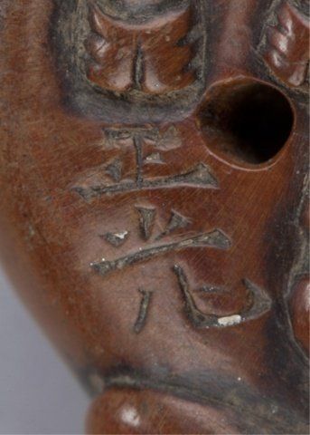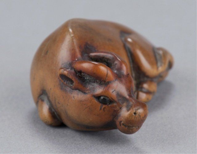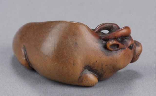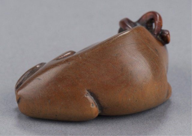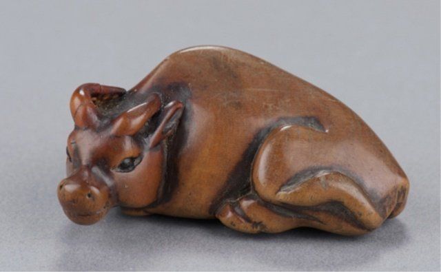 School of Masanao, Yamada, Early 19th century. Reclining, head turned slightly to the left, the eyes inlaid in black. Smoothly finished and with a nice patina, the legs and hooves are defined on the underside along with two good himotoshi. Inscribed on the underside, Masamitsu. Left horn repaired. 2in (5cm). Provenance: Ex Scott Meredith collection.