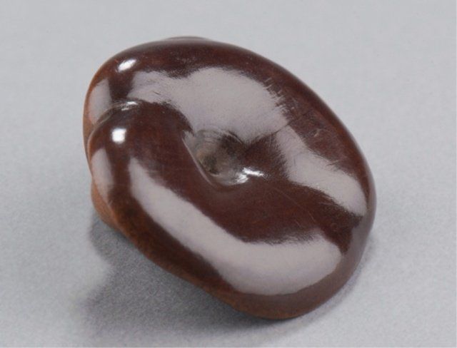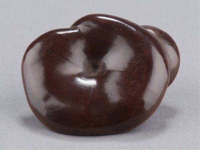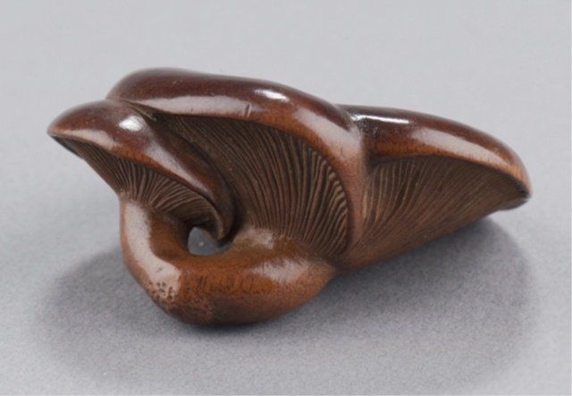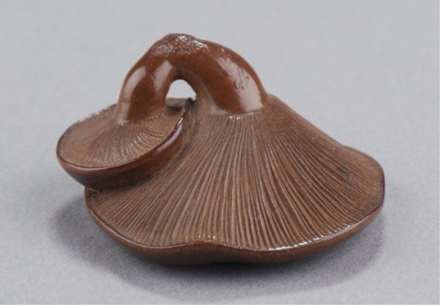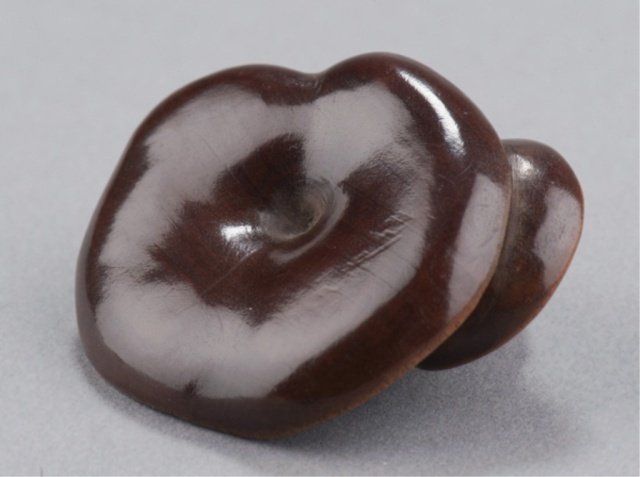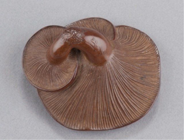 By Tadatoshi (circa 1770-1840), Nagoya, Mid 19th century. On a common stalk which forms the himotoshi, the top is smoothly polished and of a rich dark brown color, the gills are delicately and naturalistically carved and unstained. Signed on the stalk, Tadatoshi. 7/8in (2.2cm). Exhibited: Delgado Museum, New Orleans, LA (March-April, 1960)
