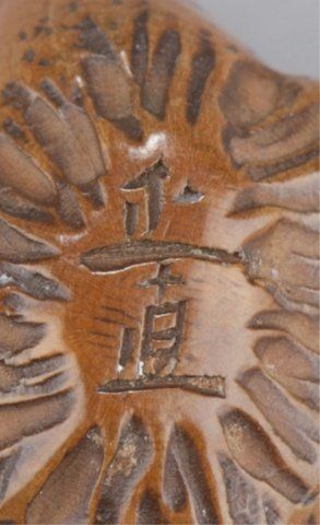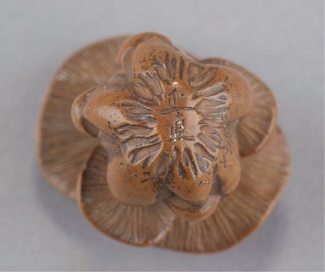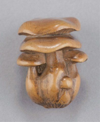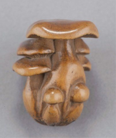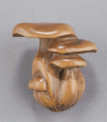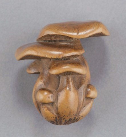 By Masanao II or Shawaw(III?), Yamada, Mid 19th century. Comprised of three larger and two smaller fungi, the larger with gills on their undersides, stained a lovely light golden brown, some wear and patination. Signed on the underside of stem in a polished reserve, Masanao. 1 1/2in (3.7cm).