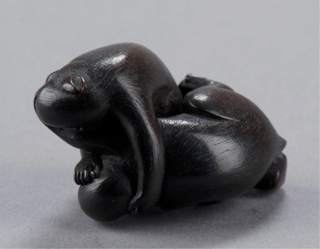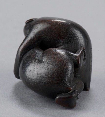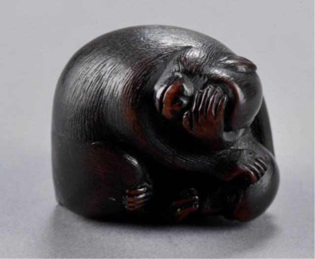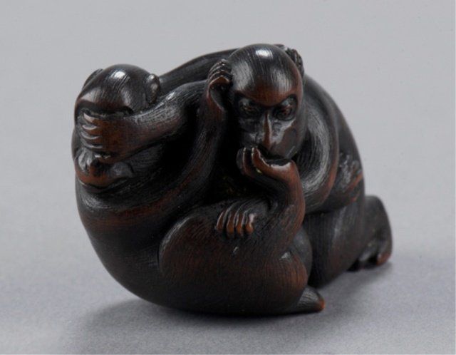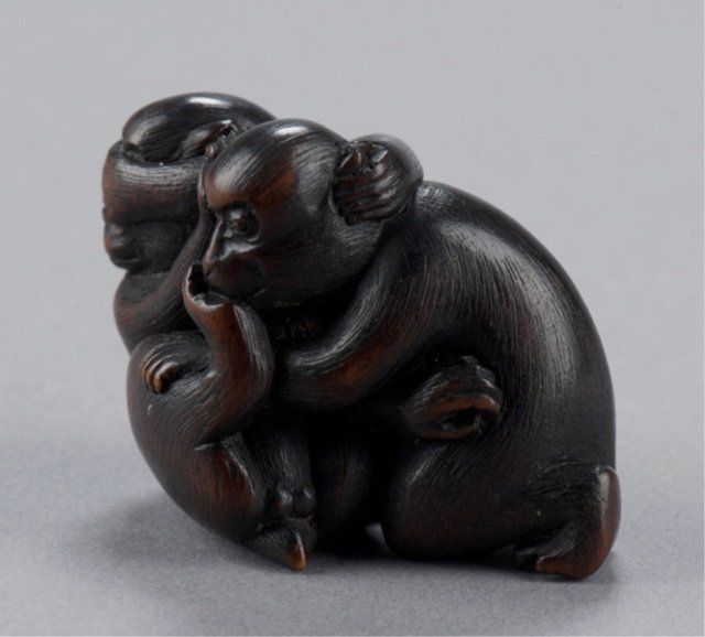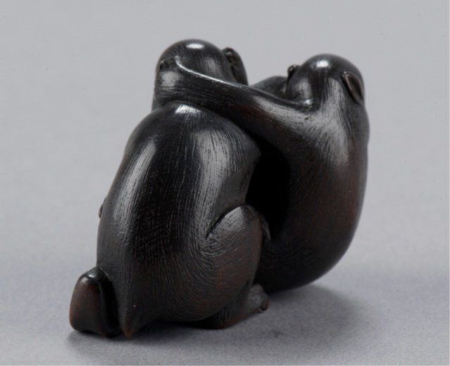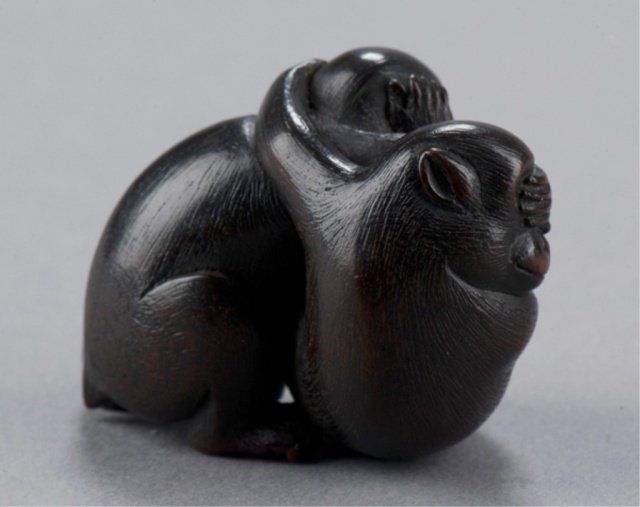 After Kaigyokusai Masatsugu, Osaka, , Mid 19th century. Depicting see/hear/speak no evil, with good hair work taking on a leathery appearance from the almost black staining over reddish wood giving a Nagoya look. Signed on the right side, Kaigyokusai. 1 1/4in (3.2cm). Provenance: Ex Scott Meredith collection.