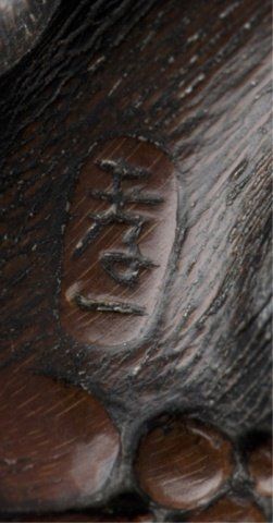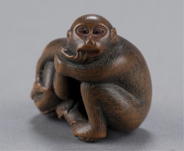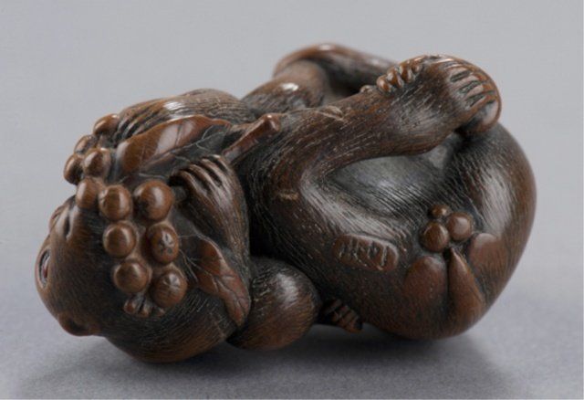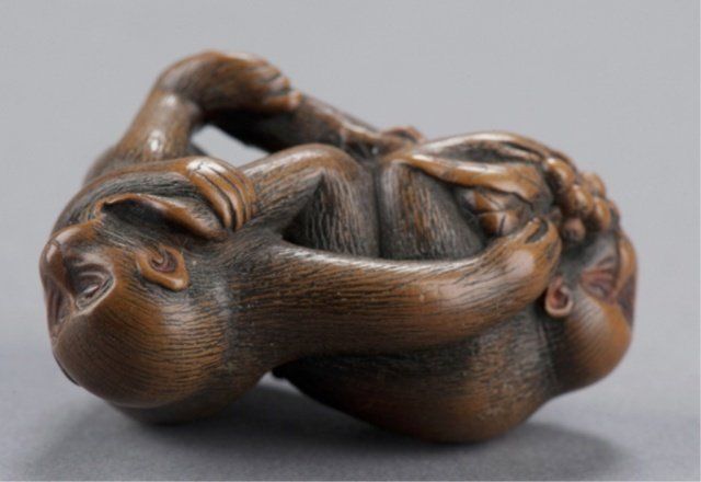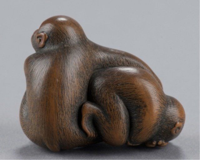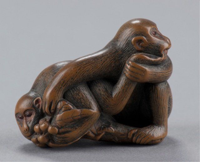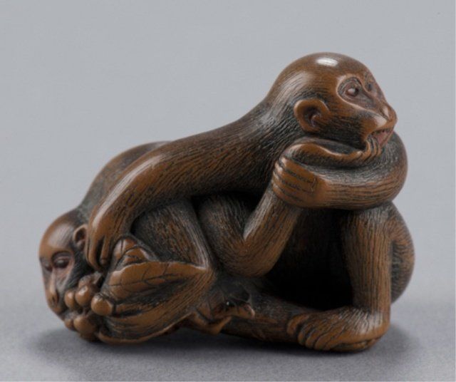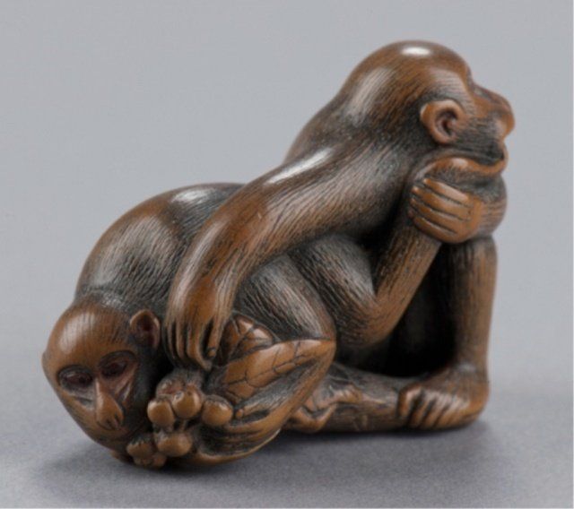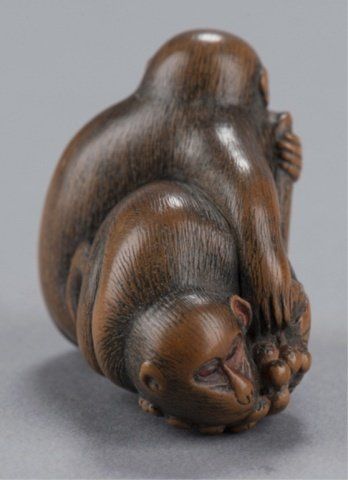 By Koichi, School of Toyomasa, Early 19th century. Fighting over a bunch of biwa fruit, the hair-work boldly carved and the eyes double inlaid in dark red horn with black pupils. Traces of light red paint highlight the mouth of one monkey and the eyes and ears of the other. The cord attachment made through natural openings. Signed on a raised oval reserve, Koichi.1 7/8in (4.6cm). Provenance: Purchased from Joseph U. Seo, 1954. Illustratted in the MCI page 357.