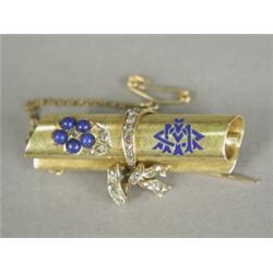 A yellow metal (tests at least 18ct) brooch in the form of a scroll, set with a lapis lazuli and rose cut diamond flower, with a blue enamel monogram, tied with a rose cut diamond set ribbon, with a safety chain, later 9ct pin, 4.5cm long Est. 150/200
